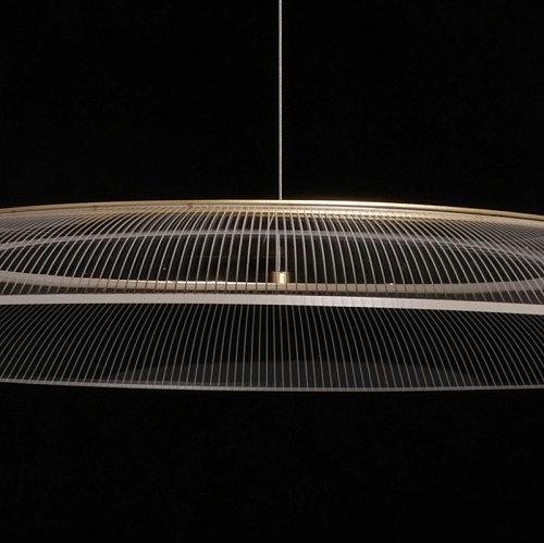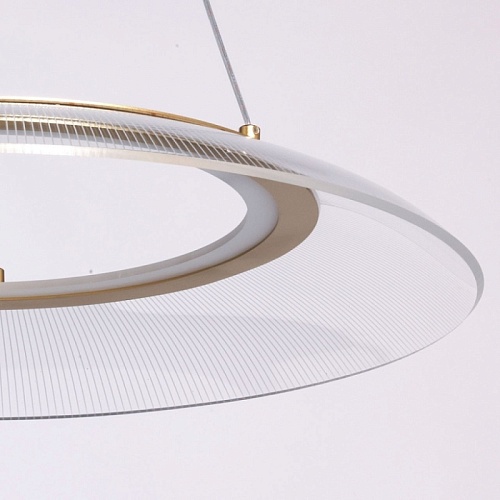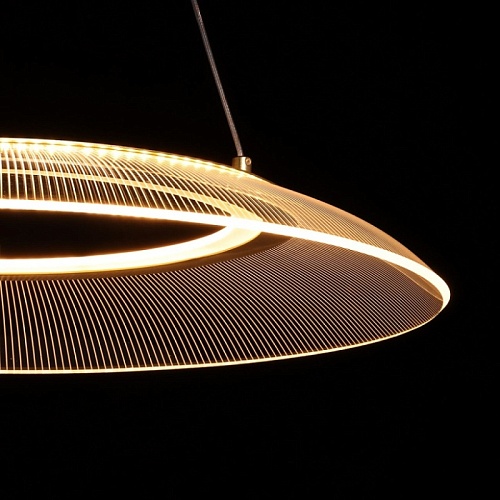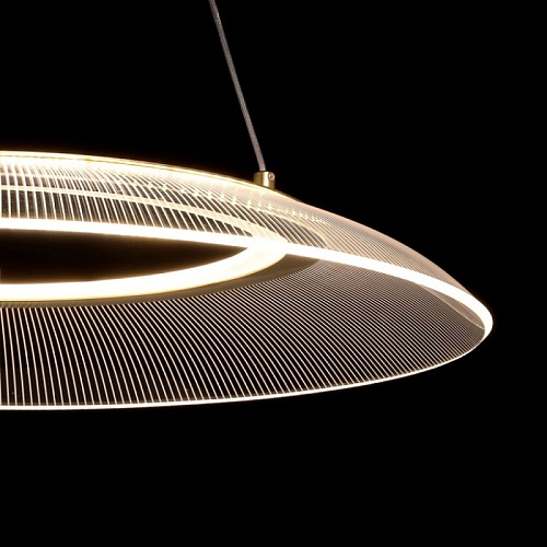 Металлическое основание подвесной люстры гальванизировано в цвет латуни. Корпус плафона выполнен из сплава алюминия с цинком и гальванизирован в цвет основания. Светодиодный источник света закрыт прозрачным акрилом с рисунком.