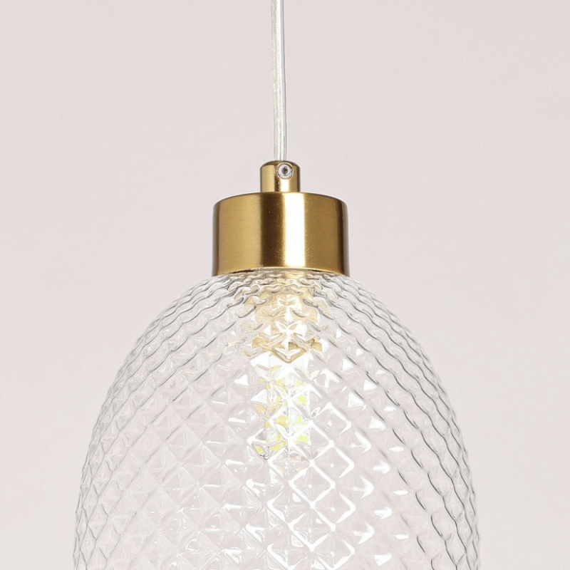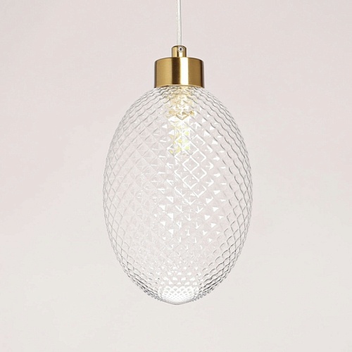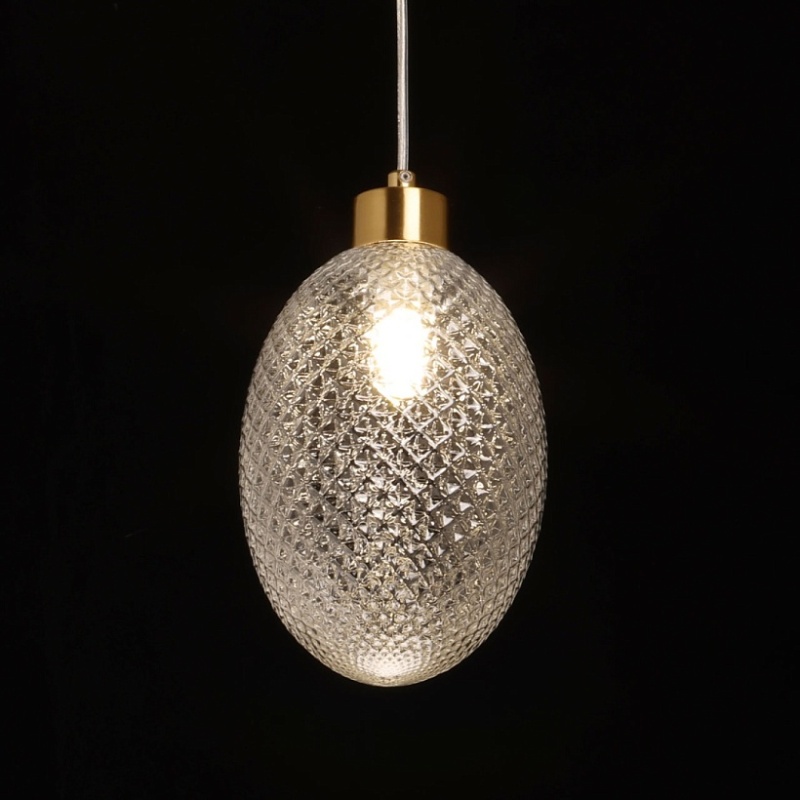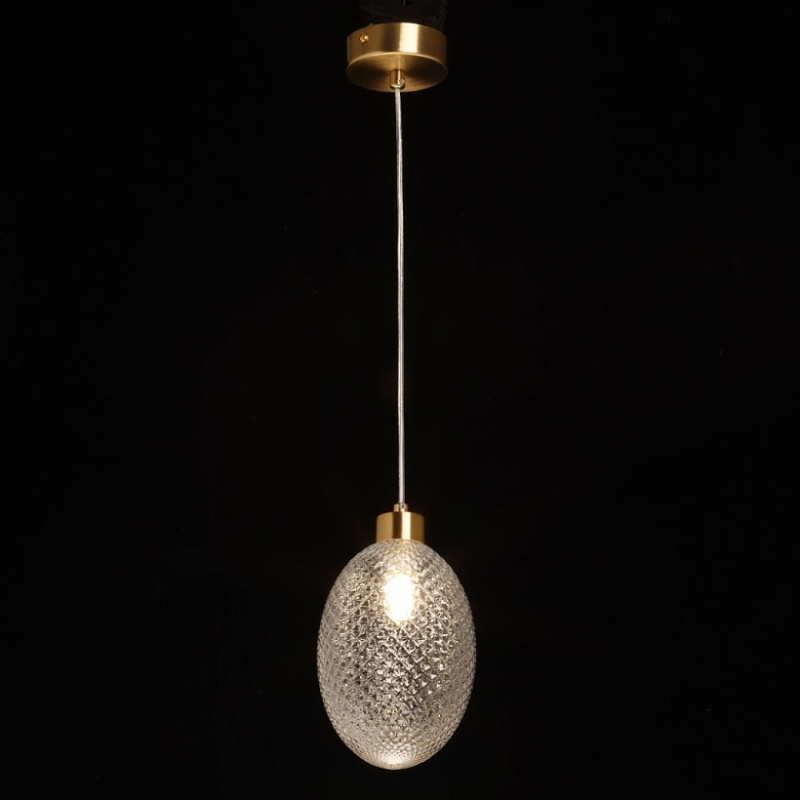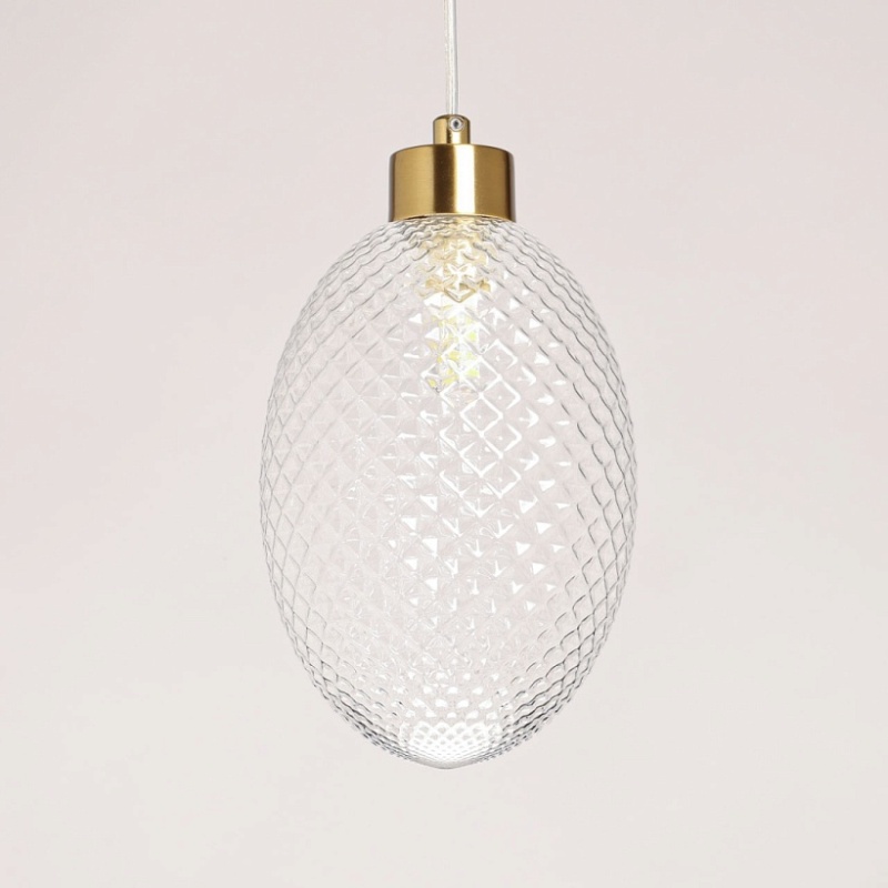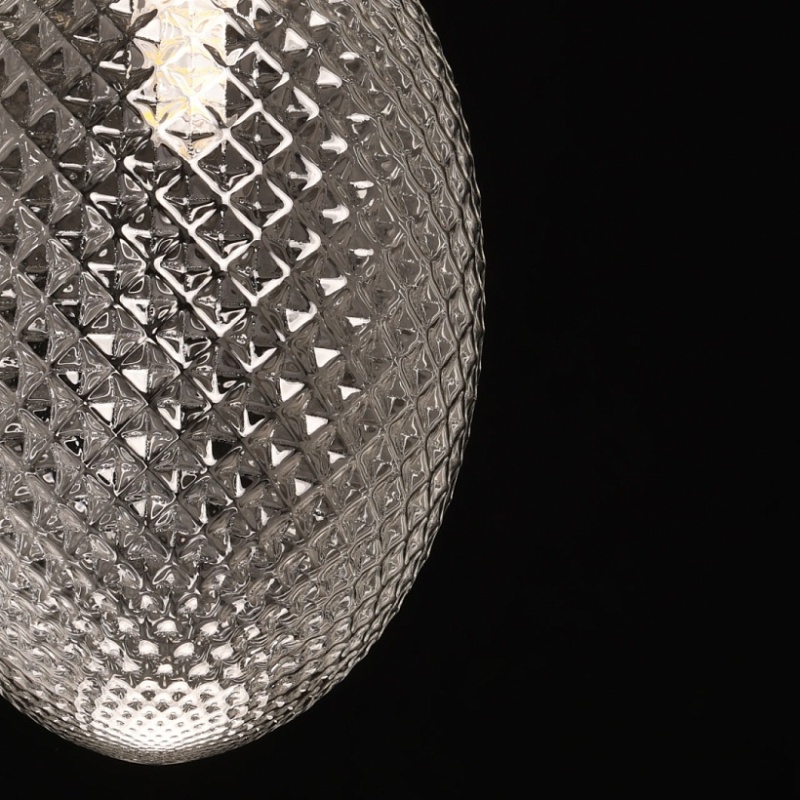 Металлическое основание подвеса гальванизировано в цвет латуни. Оригинальный плафон из фактурного стекла отлит в сложную форму.