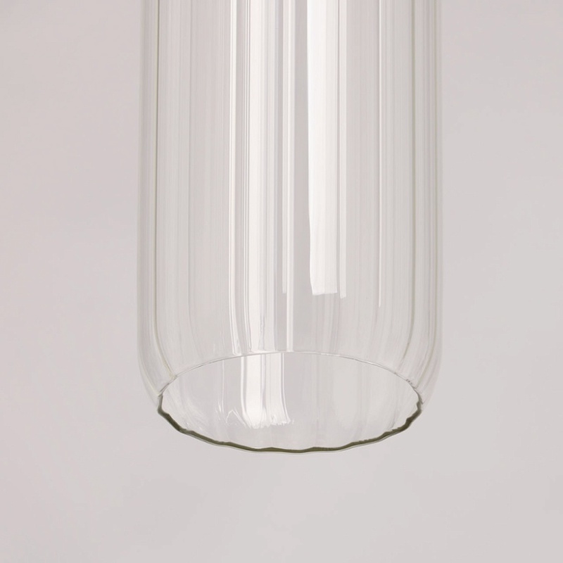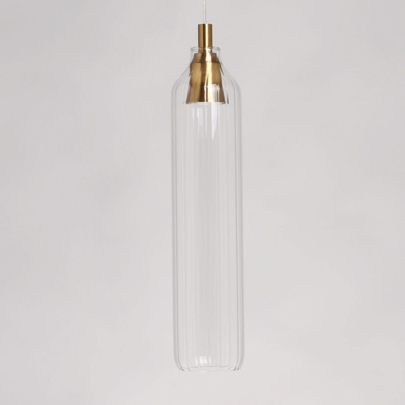 Металлическое основание подвеса гальванизировано в цвет латуни. Плафон вытянутой формы отлит из прозрачного стекла.