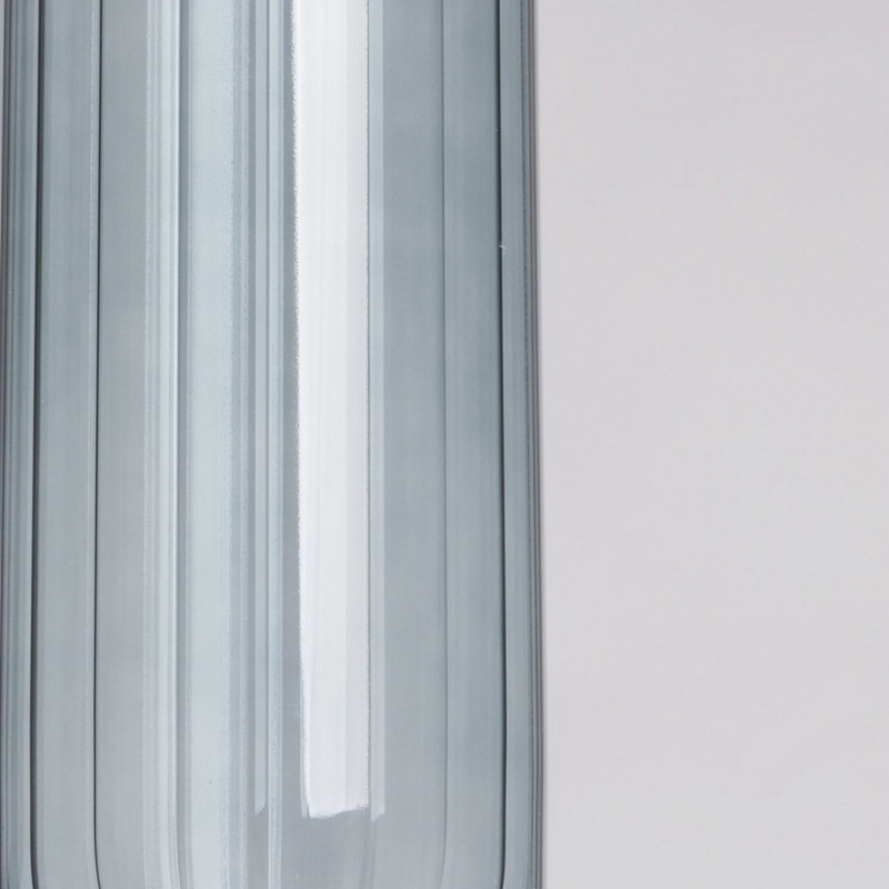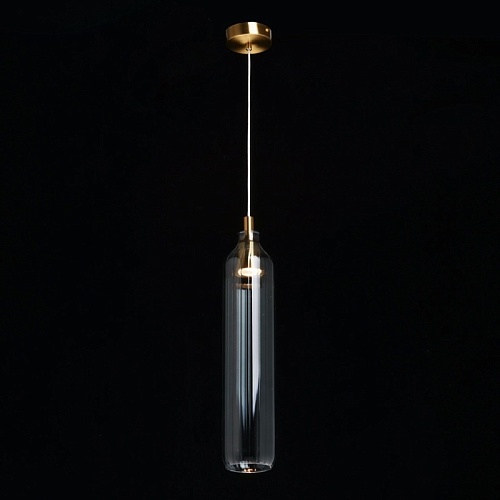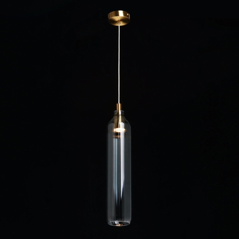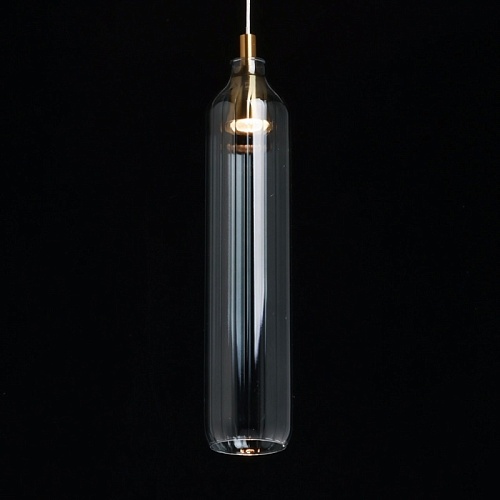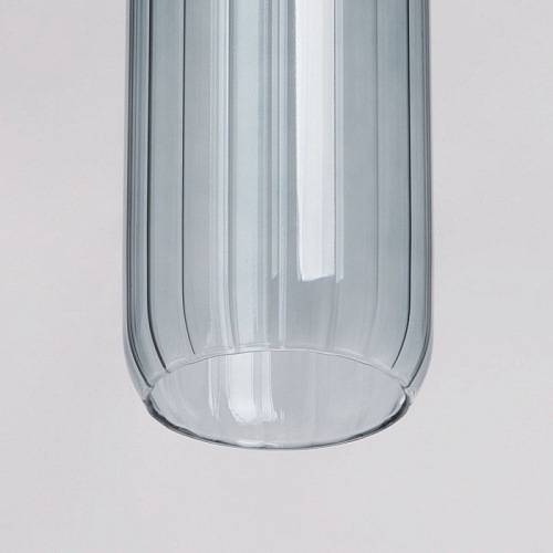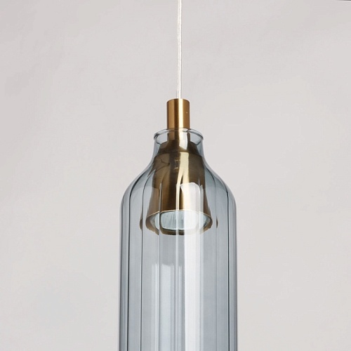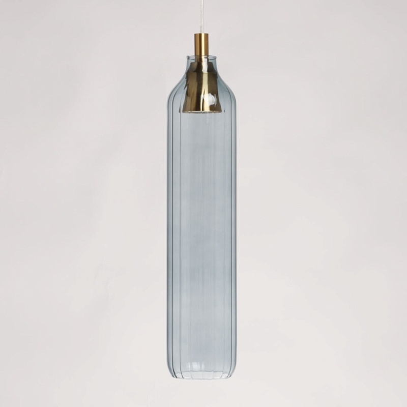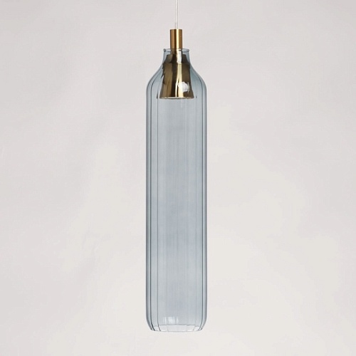 Металлическое основание подвеса гальванизировано в цвет латуни. Плафон вытянутой формы отлит из стекла и гальванизирован в дымчатый цвет.