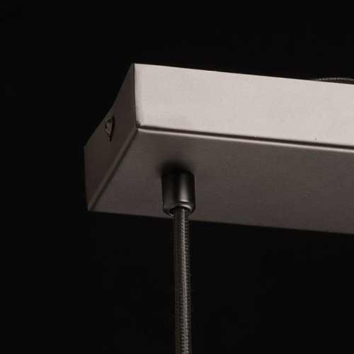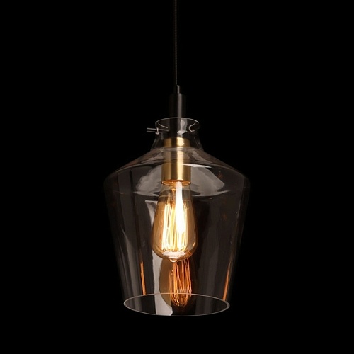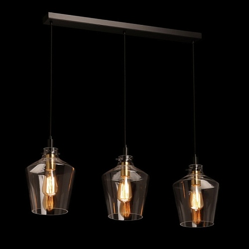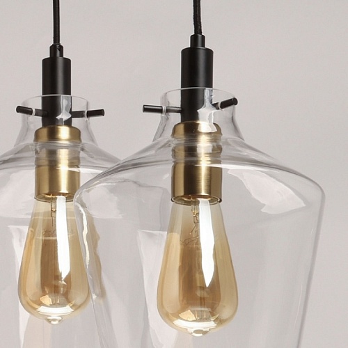 Металлическое основание подвесной люстры окрашено в черный цвет. Отдельные элементы основания гальванизированы в цвет латуни. Прозрачные стеклянные плафоны отлиты в сложную форму.