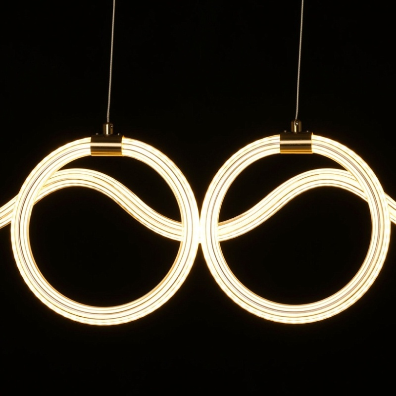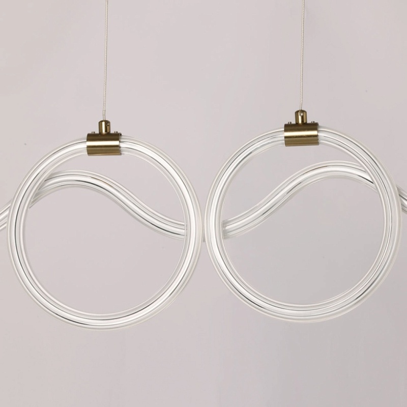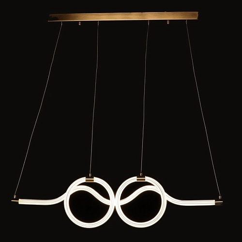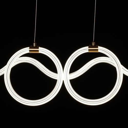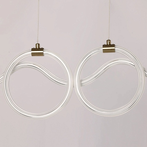 Металлическое основание подвесной люстры гальванизировано в цвет латуни. Светодиодные источники света закрыты белым матовым силиконом, заключенным в плафон из прозрачного акрила с линейным рисунком.