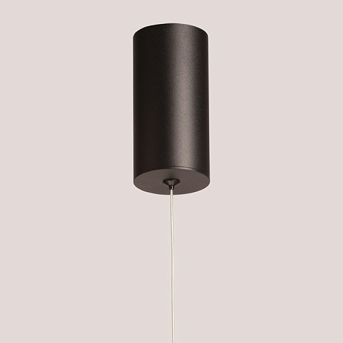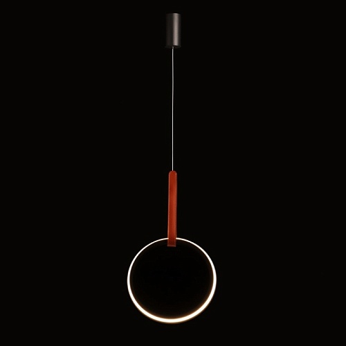 Металлическое основание подвеса окрашено в черный цвет. Корпус плафона выполнен из сплава алюминия с цинком и окрашен в цвет основания. Светодиодные источники света закрыты белым матовым акрилом. Подвес декорирован держателем из экокожи коричневого цвета.