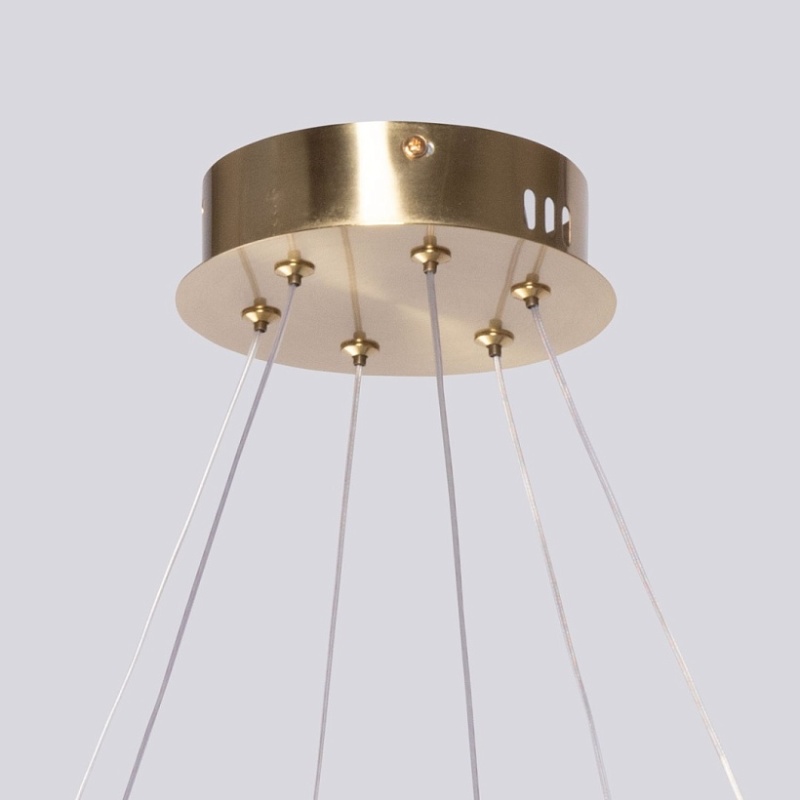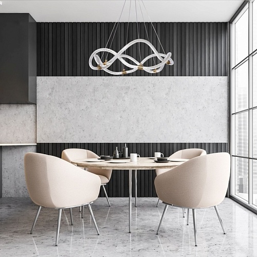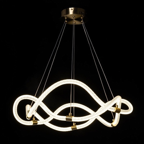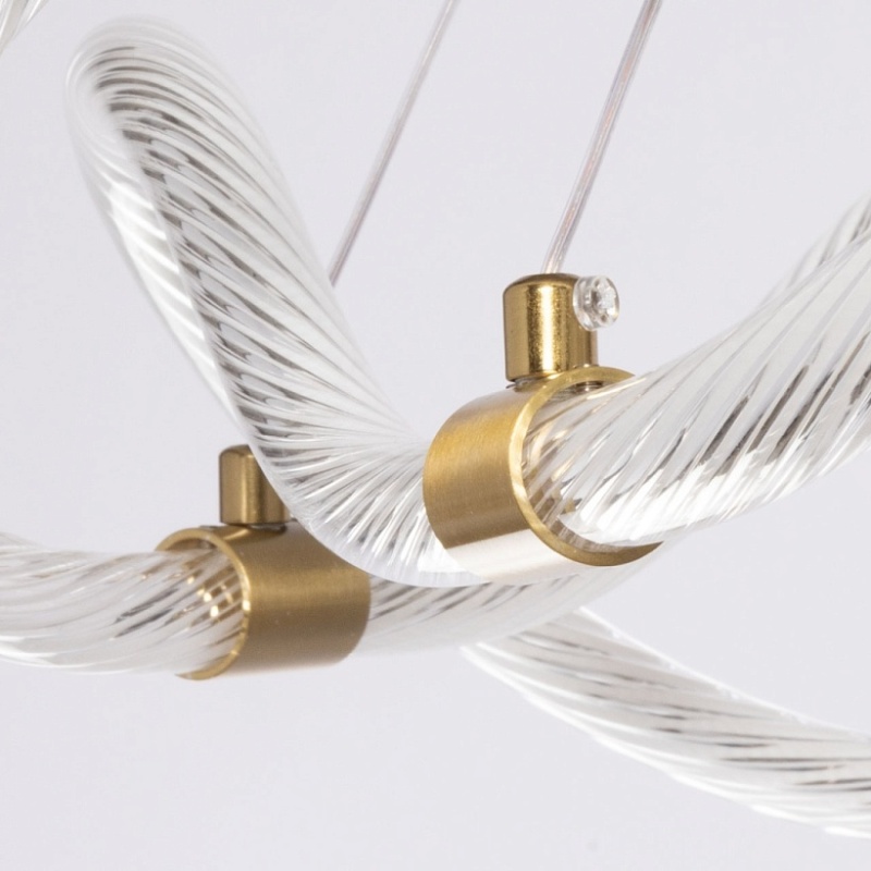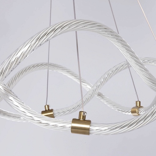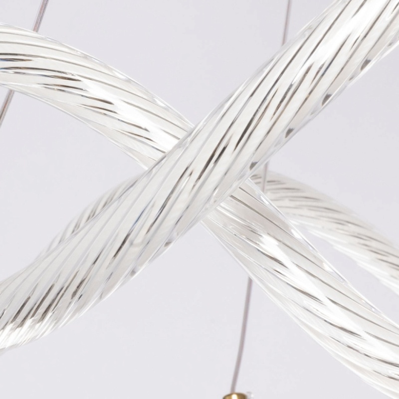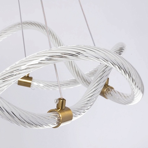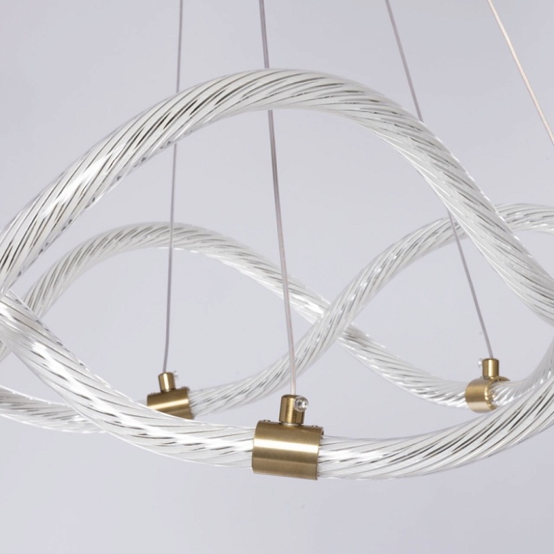 Металлическое основание подвесной люстры гальванизировано в цвет латуни. Светодиодный источник света закрыт оригинальным плафоном изогнутой формы, выполненным из прозрачного литьевого акрила.