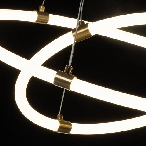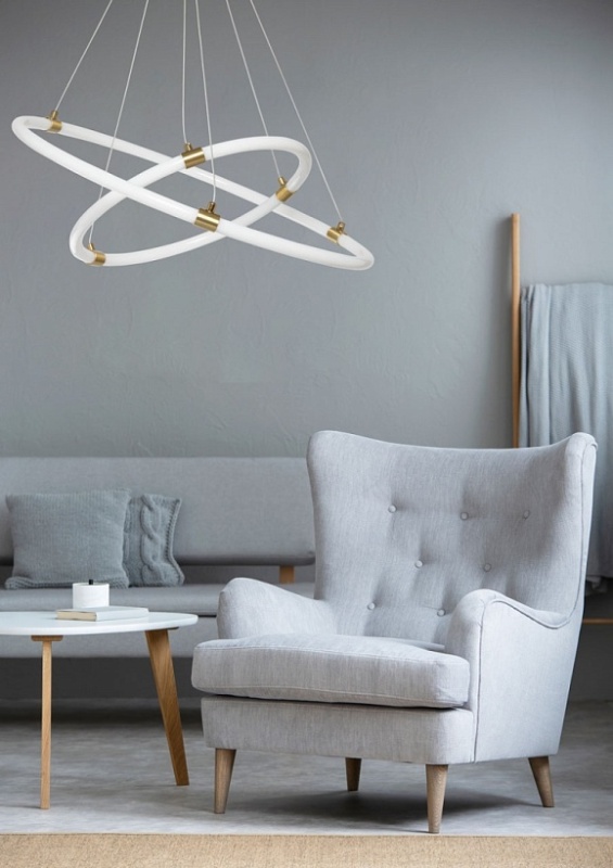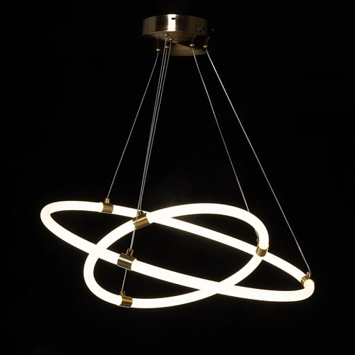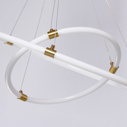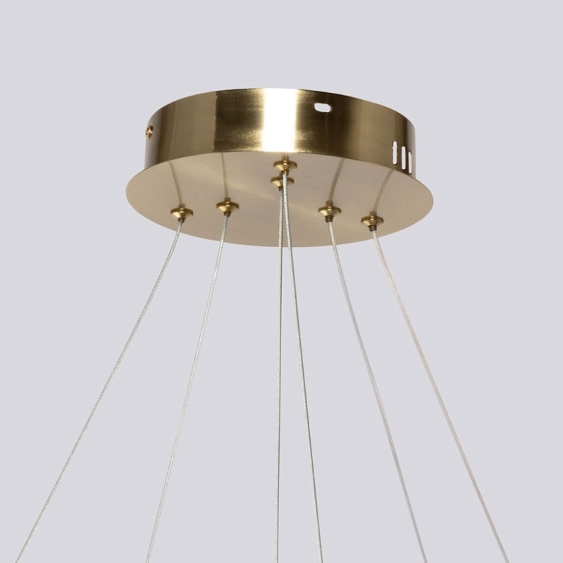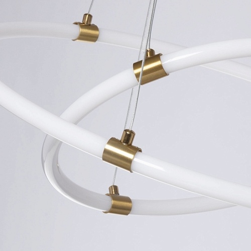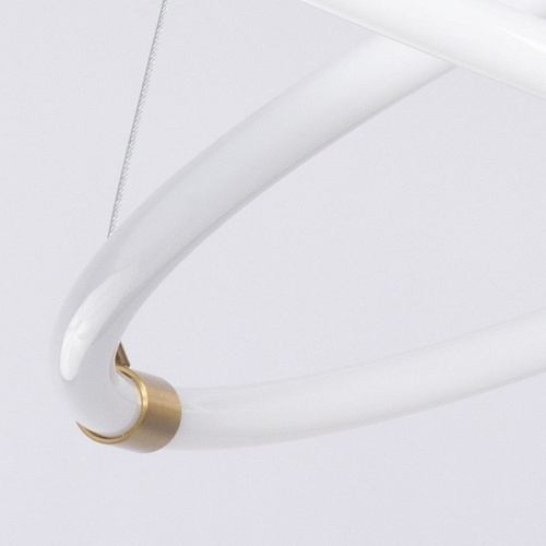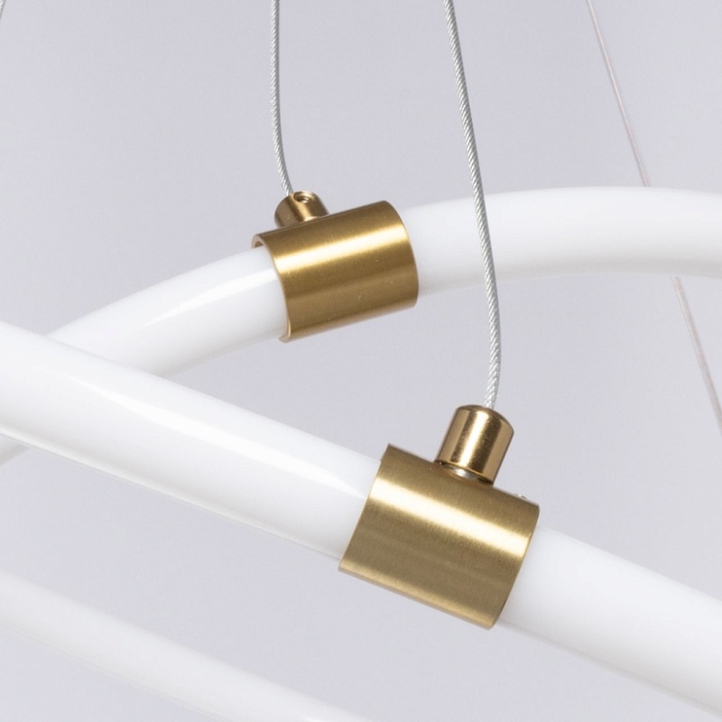 Металлическое основание подвесной люстры гальванизировано в цвет латуни. Светодиодный источник света закрыт белым матовым акрилом.
