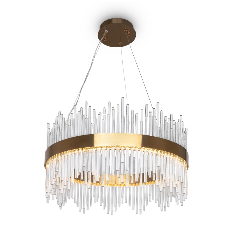 Металлическая арматура. Цвет – золото. Декор в виде прозрачных стеклянных трубок. Трендовый эффект парения. LED-источники света энергоэффективны и долговечны в эксплуатации.