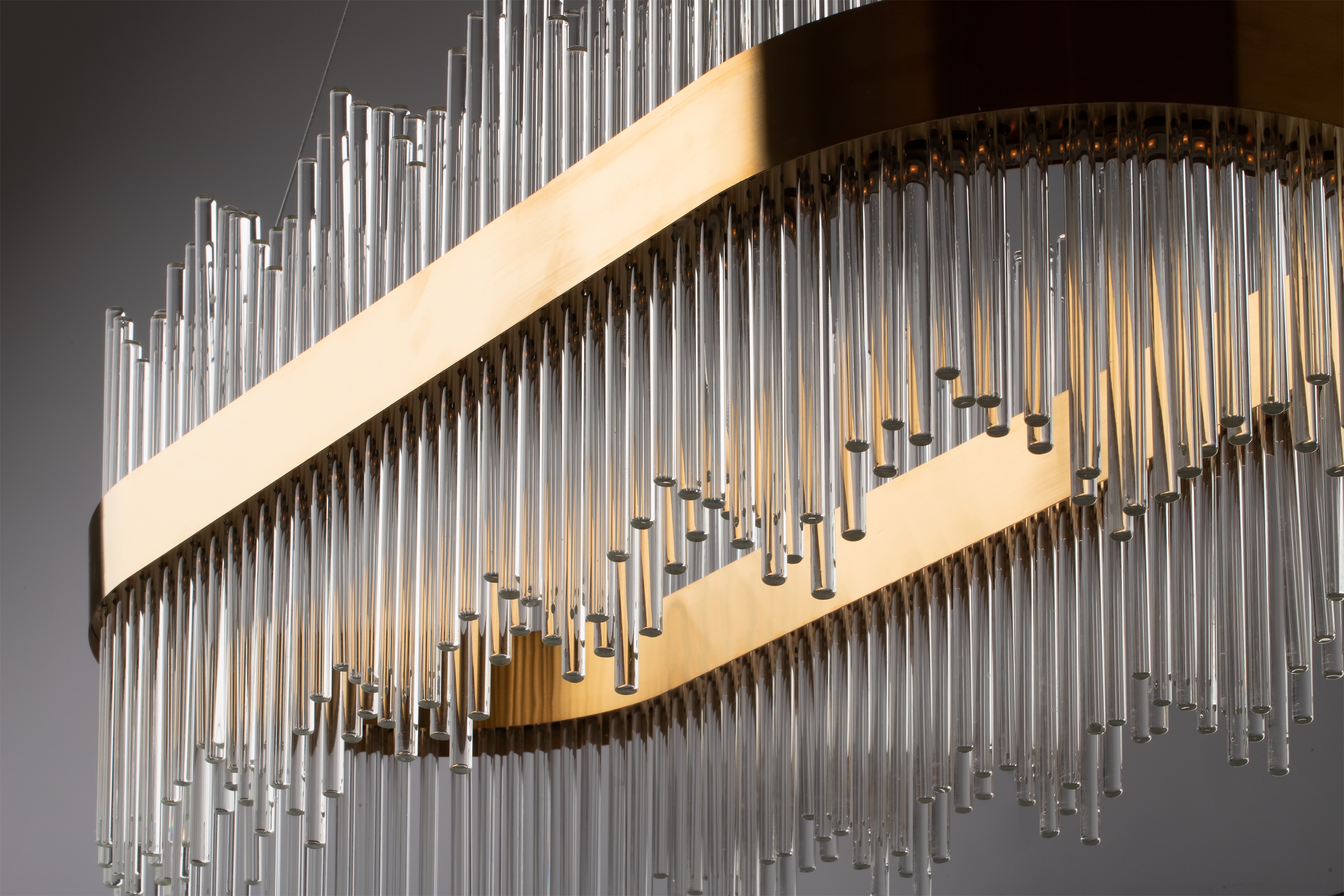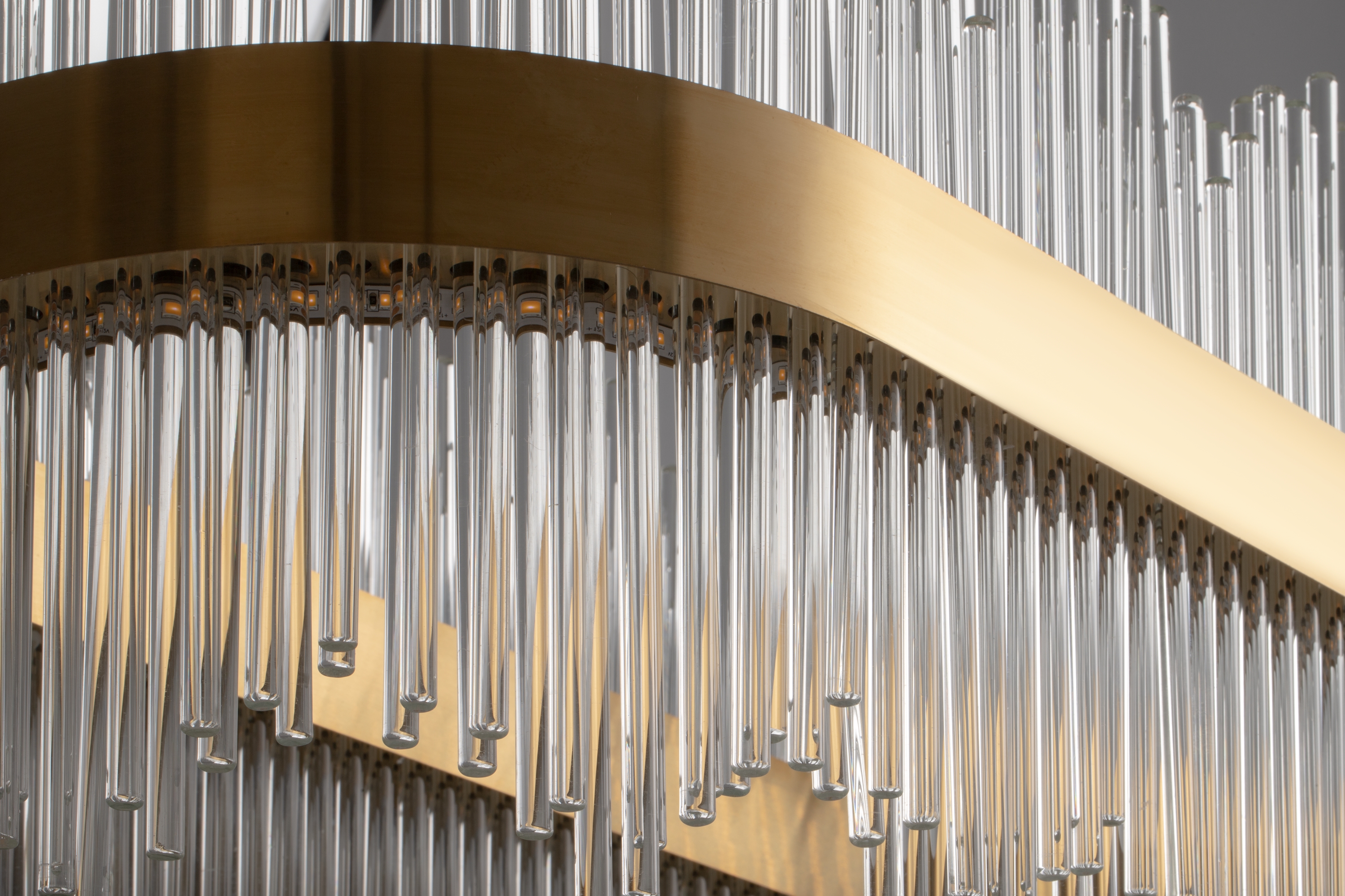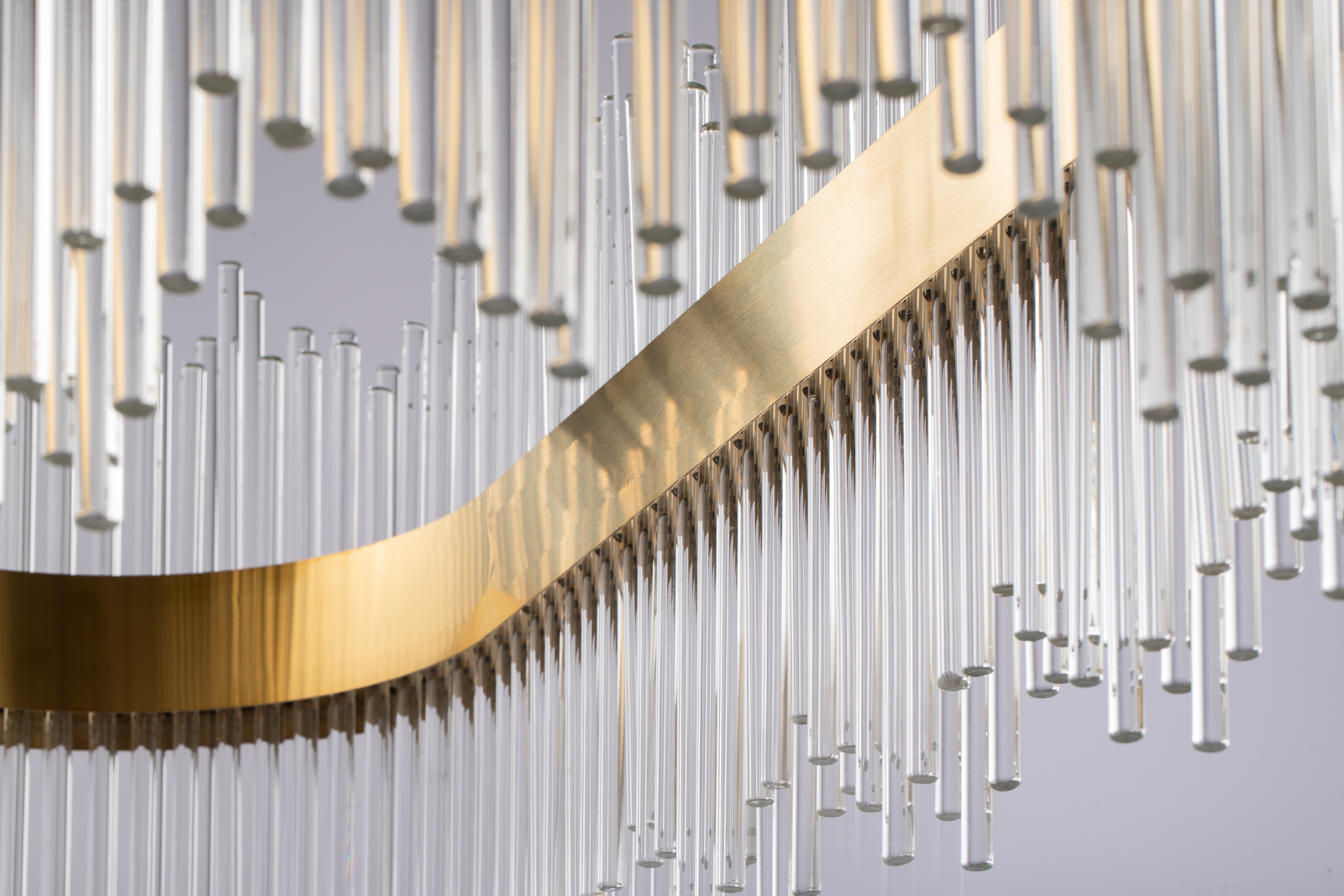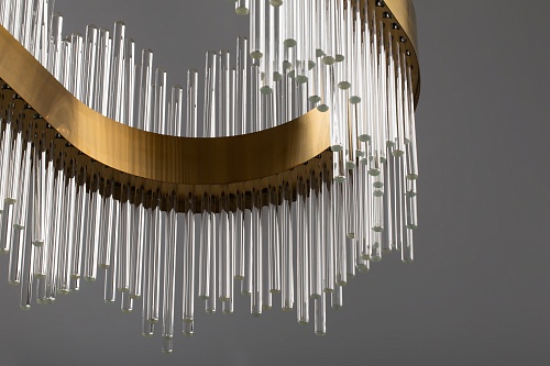 Металлическая арматура. Цвет – золото. Декор в виде прозрачных стеклянных трубок. Трендовый эффект парения. LED-источники света энергоэффективны и долговечны в эксплуатации.