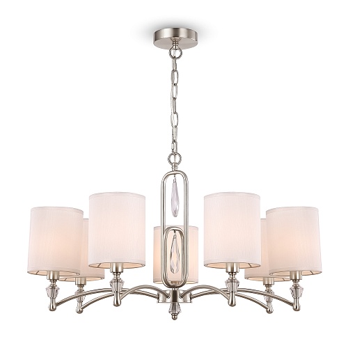 Материал арматуры – нержавеющая сталь, цвет – хром. Материал абажуров – текстиль на ПВХ, цвет – белый. Декор – прозрачное стекло. Акцентные стеклянные кристаллы на рожках со сложной огранкой.