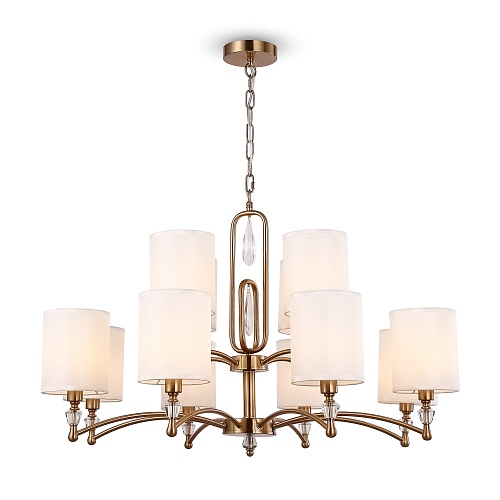 Материал арматуры – нержавеющая сталь, цвет – хром. Материал абажуров – текстиль на ПВХ, цвет – белый. Декор – прозрачное стекло. Акцентные стеклянные кристаллы на рожках со сложной огранкой.
