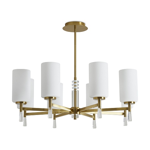 Арматура металл. Цвет латунь. Стеклянные белые плафоны хорошо рассеивают свет, направлены вверх, тем самым вытягивают потолок. Декоративные элементы в виде хрустального основания и капель из акрила. Источник света — лампа. Цоколь E27.