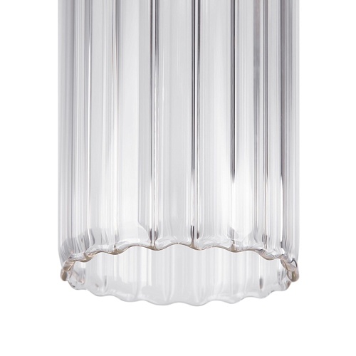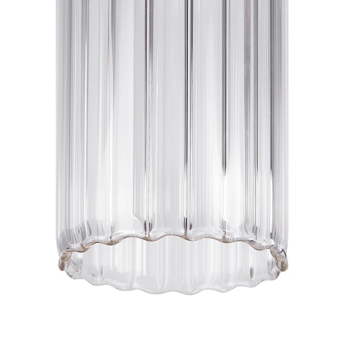 Арматура из металла черного цвета. Плафон – прозрачное ребристое стекло цилиндрической формы. Декоративная металлическая вставка золотого оттенка. Источник света – лампа с цоколем E14.
