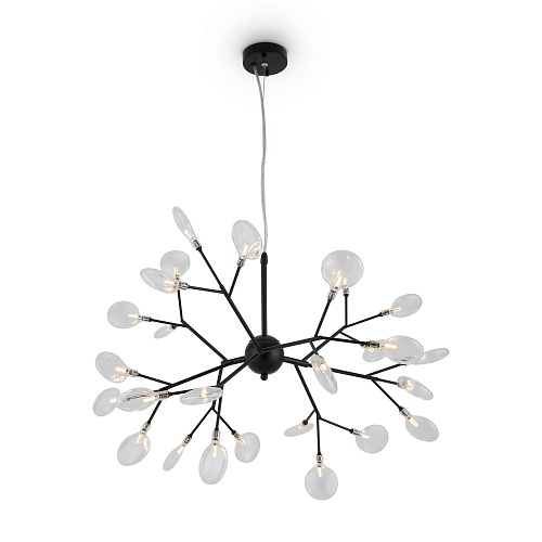 Материал арматуры – металл. Оттенки – черный, белый. Стеклянные плафоны оригинальной формы. Трендовый флористический дизайн. Источник света – лампа G4.
