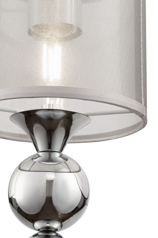 Материал арматуры – металл. Цвет – хром. Абажуры из полупрозрачной органзы серебристого оттенка. Декор – хромированные шары. Высота люстр регулируется. Одиночный подвес с цоколем Е27, лампа, бра, торшер и люстры – Е14.