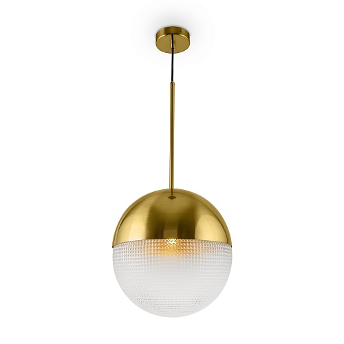 Металлическая арматура оттенка латуни. Плафон – прозрачное фактурное стекло. Трендовая сферическая форма. Источник света – лампа с цоколем E27.