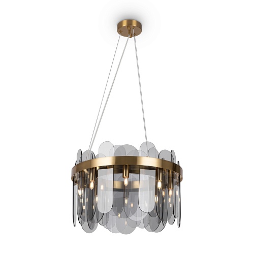Арматура из металла. Цвет – латунь и никель. Стеклянный декор в двух вариантах: фактурный с эффектом «замороженного стекла» и глянцевый дымчатого оттенка. Источник света – лампа G9.