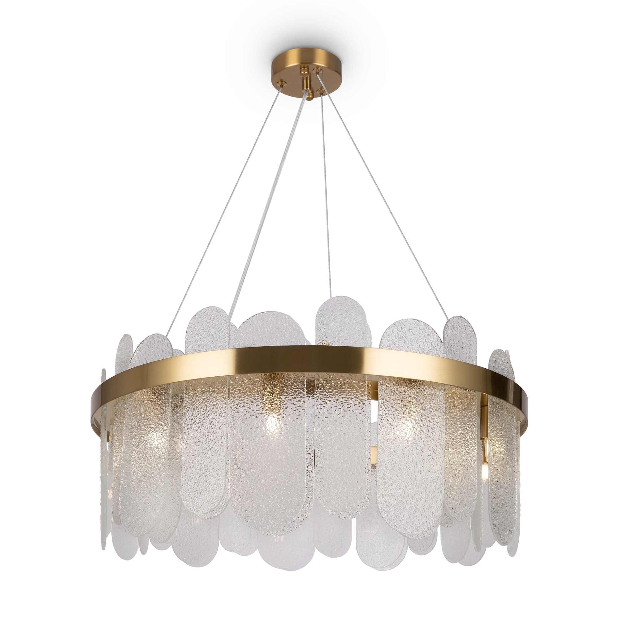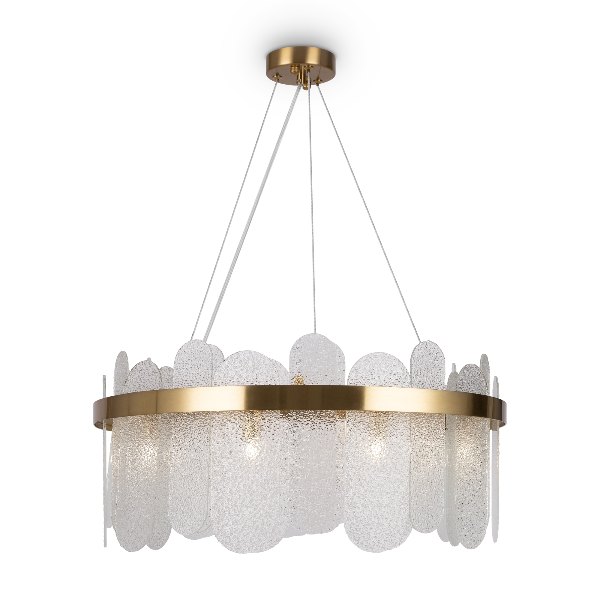 Арматура из металла. Цвет – латунь и никель. Стеклянный декор в двух вариантах: фактурный с эффектом «замороженного стекла» и глянцевый дымчатого оттенка. Источник света – лампа G9.