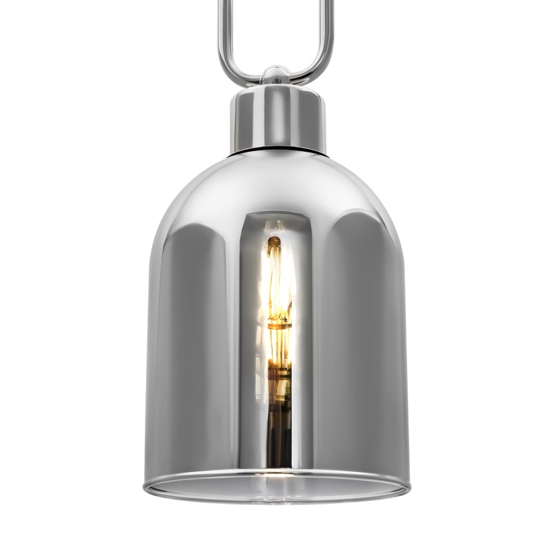 Хромированная металлическая арматура. Стеклянный плафон гальванизирован в тон арматуре. Трендовый арочный силуэт. В качестве источника света используется лампа с цоколем Е27.