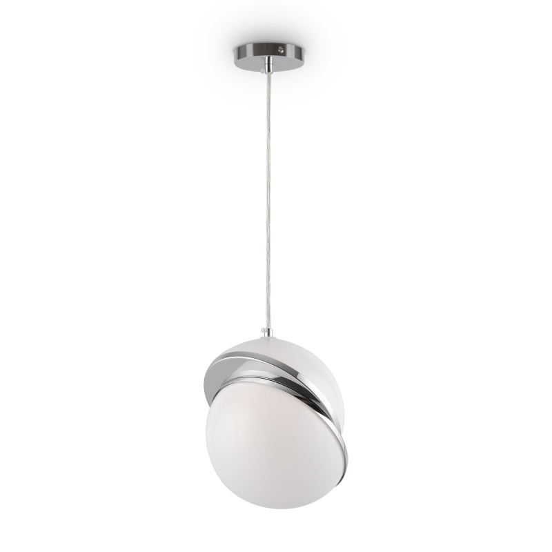 Металлическая арматура. Оттенки – хром, латунь. Плафон – матовое белое стекло с металлическим кантом. Футуристический дизайн, трендовая асимметричная форма. Заменяемый источник света, цоколь Е27.