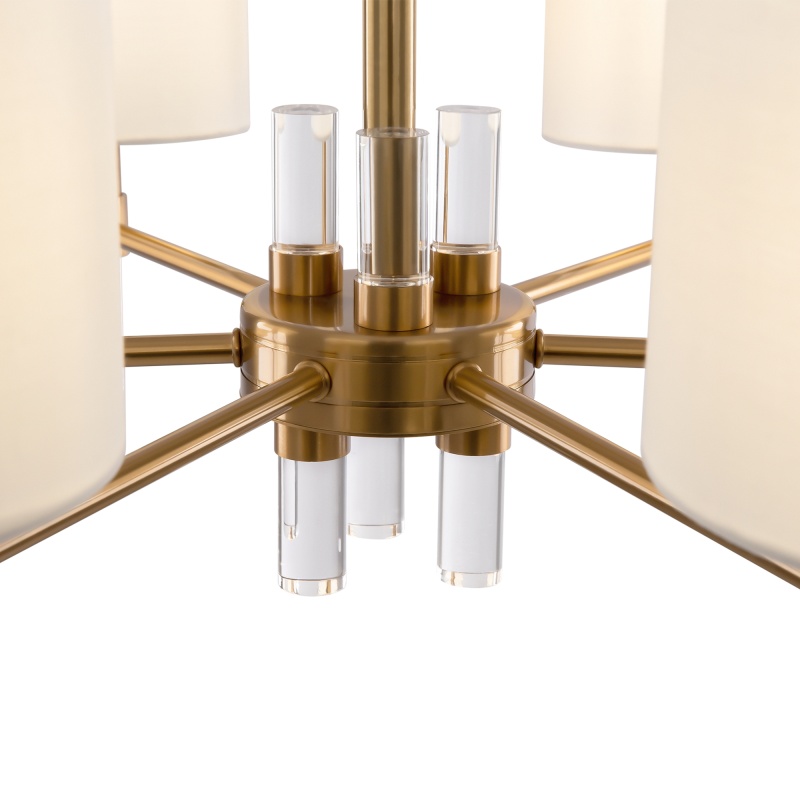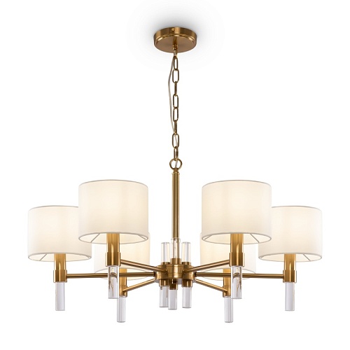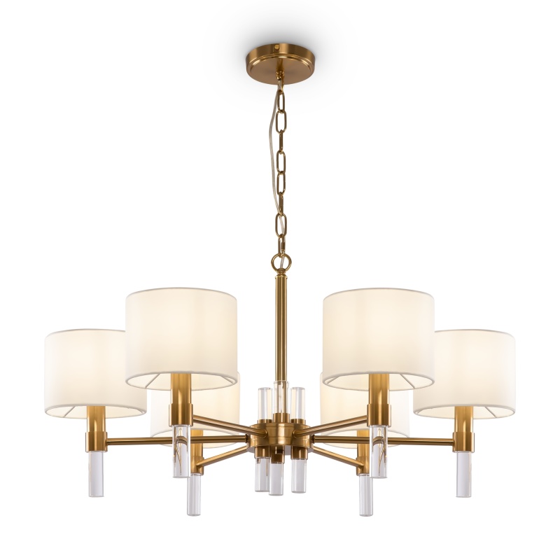 Металлическая арматура. Цвет – латунь. Тканевые абажуры белого оттенка. Декор – прозрачные акриловые трубки. Трендовая комбинация фактур и материалов. Широкий ассортимент. Торшер и подвес с цоколем Е27, лампа, бра и люстры – Е14.