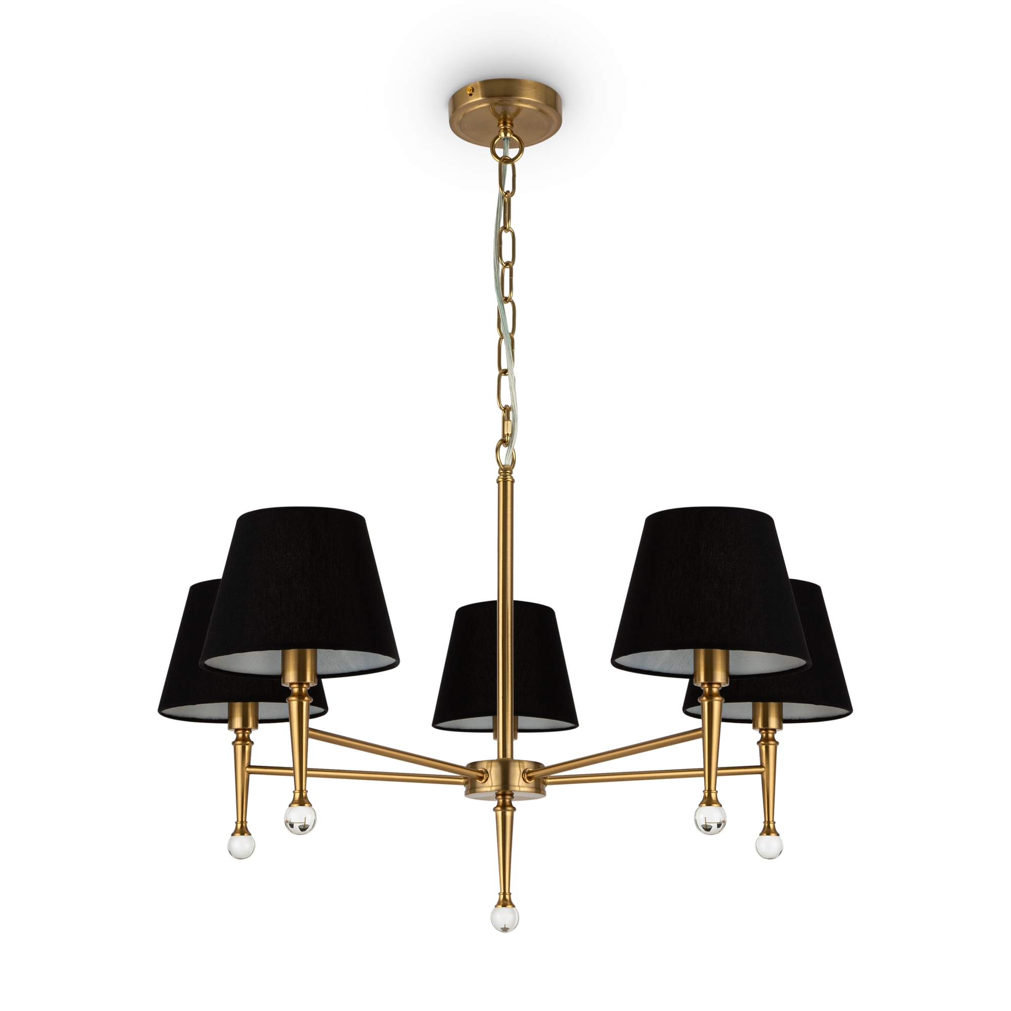 Арматура - металл, плафоны - стекло. Цветовые комбинации арматуры и плафона: черный + прозрачный, черный + янтарный, латунь + прозрачный. Элементы декора - выдувные «бусины» из стекла. Высота проводов регулируется. Источник света - лампа с цоколем GU10.