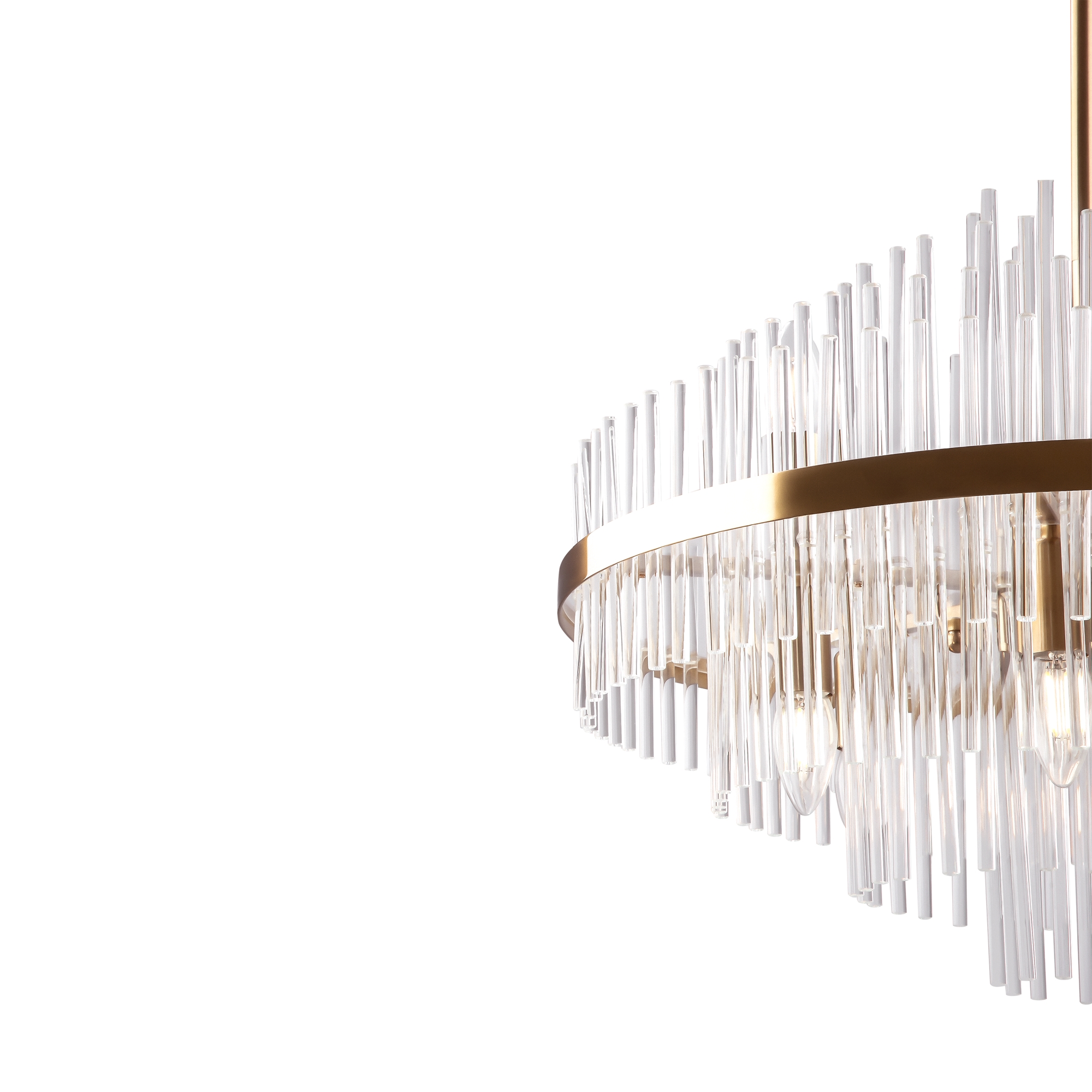 Металлическая арматура, цвет - латунь. Декоративные элементы - прозрачные стеклянные трубки, обрамленные в металлической кольцо в тон арматуре. Источник света - лампа с цоколем Е14.
