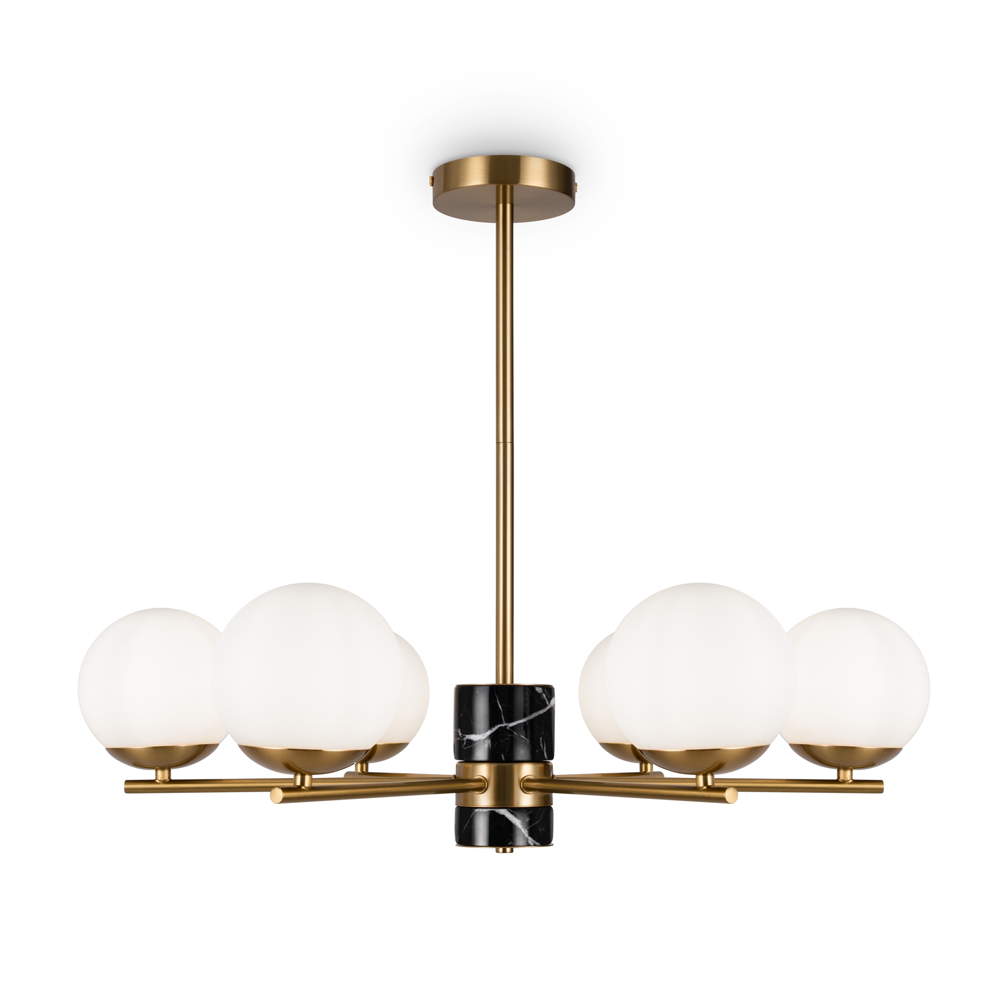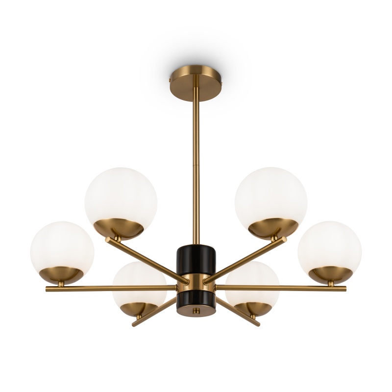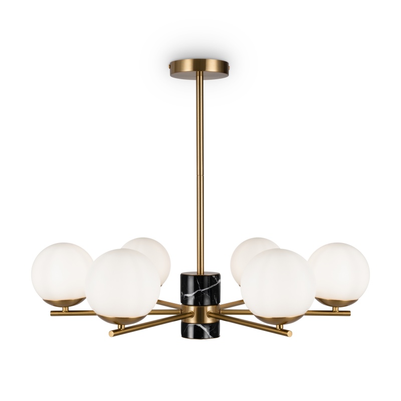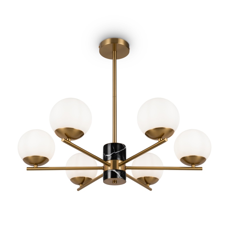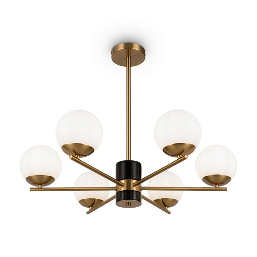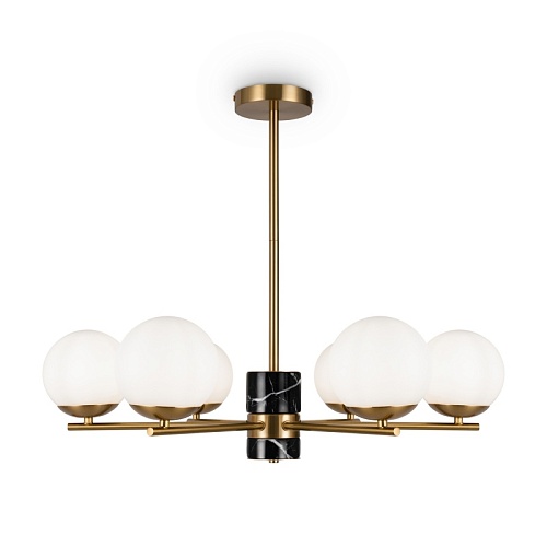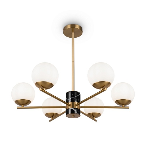 Арматура - металл, цвет - латунь. Мраморные черные элементы в основании. Плафоны-сферы из белого матового стекла с металлической апликацией у основания крепления в цвет арматуры. Сменямый источник света - лампы с цоколем Е27.