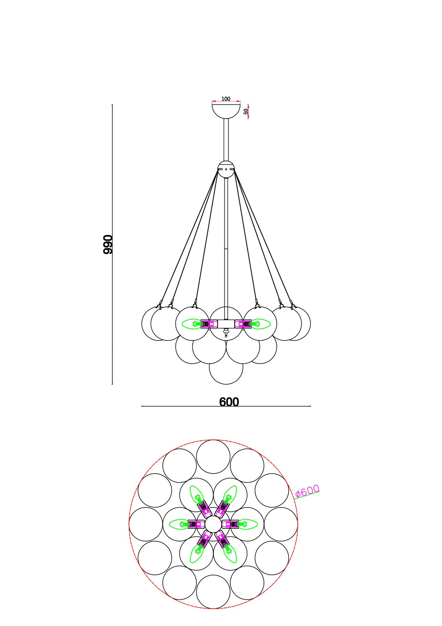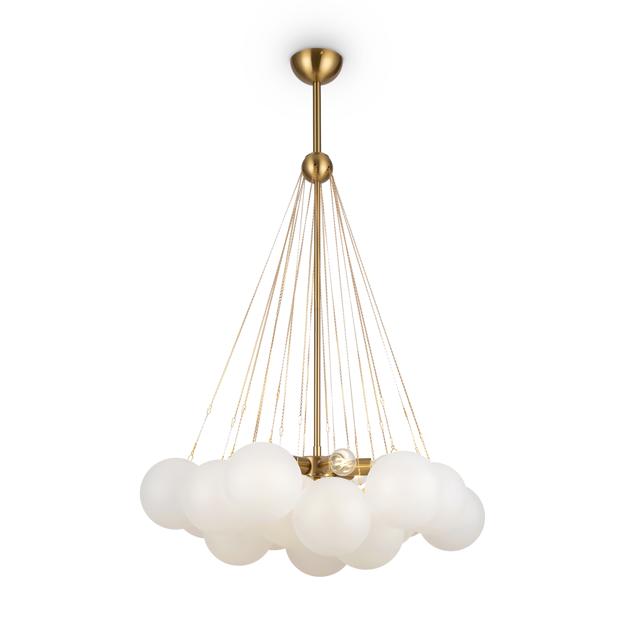 Арматура - металл, оттенки - хром и латунь. Плафоны-сферы из белого матового стекла. Подвесы двух видов: с регулируемой высотой на 7, 13, 19 ламп с цоколем E27 - помещены внутри плафонов на прозрачных проводах, и с фиксированной высотой на 6 ламп с цоколем Е14 - незаметно расположены над декоративным "облаком" плафонов.