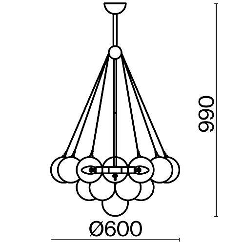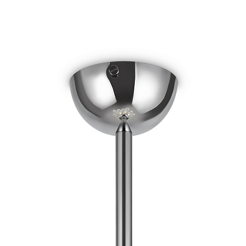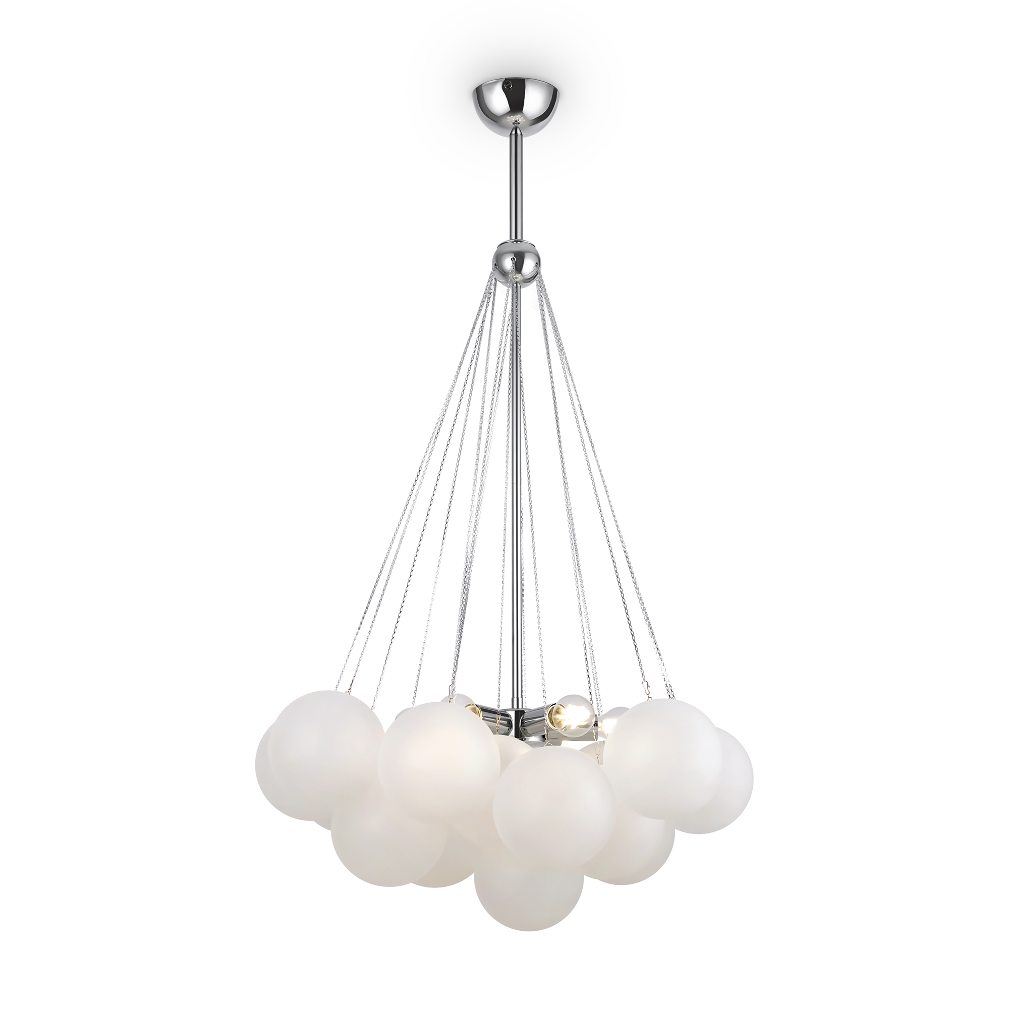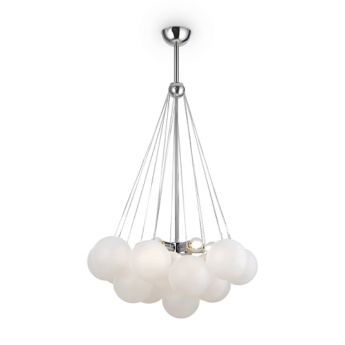 Арматура - металл, оттенки - хром и латунь. Плафоны-сферы из белого матового стекла. Подвесы двух видов: с регулируемой высотой на 7, 13, 19 ламп с цоколем E27 - помещены внутри плафонов на прозрачных проводах, и с фиксированной высотой на 6 ламп с цоколем Е14 - незаметно расположены над декоративным "облаком" плафонов.
