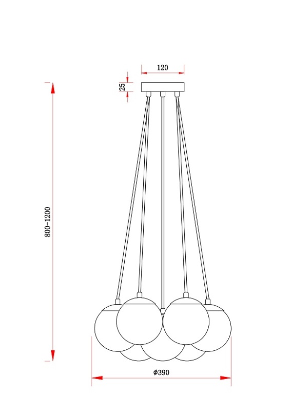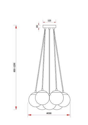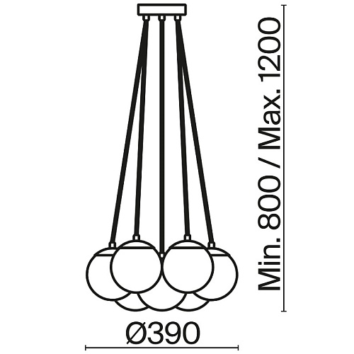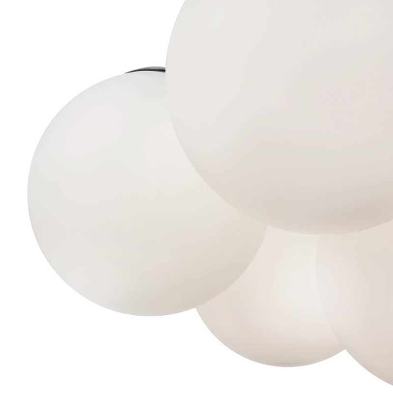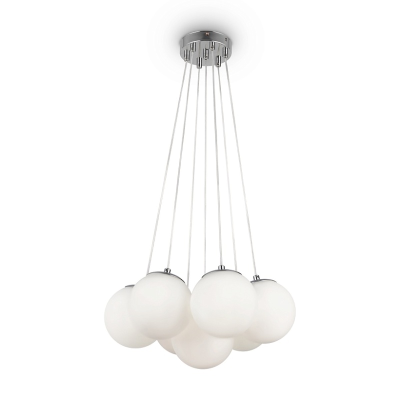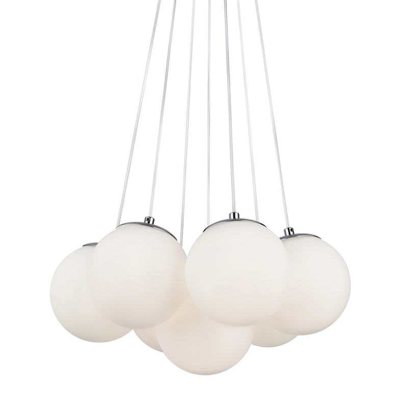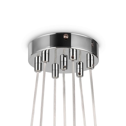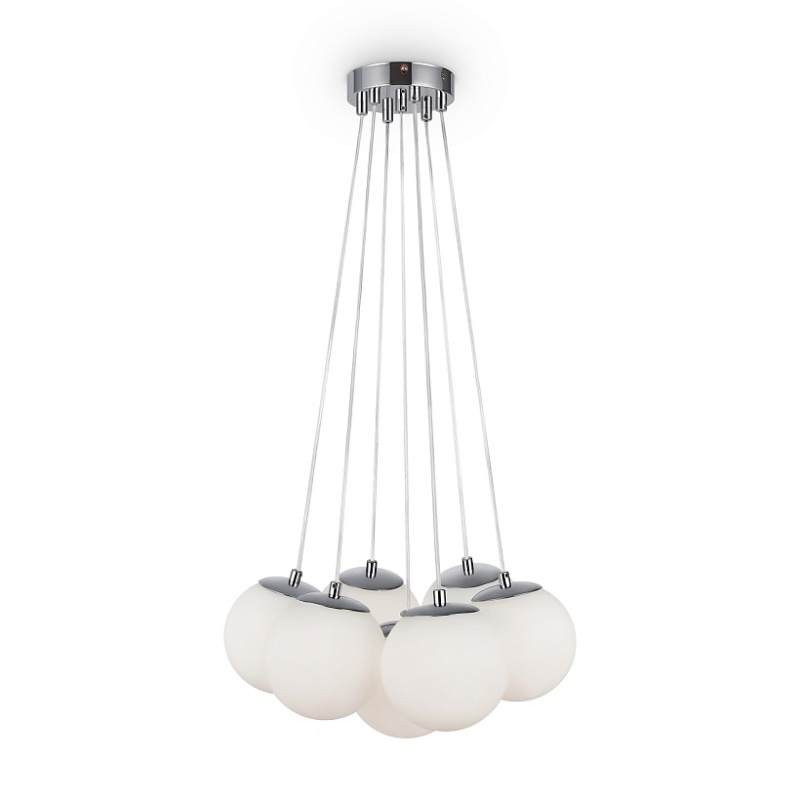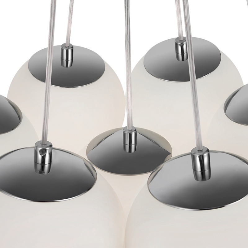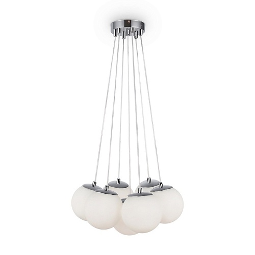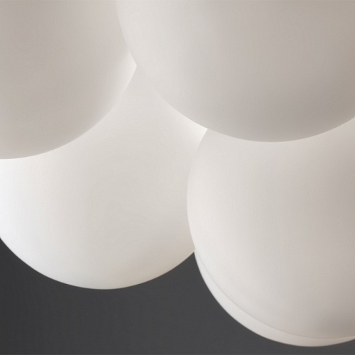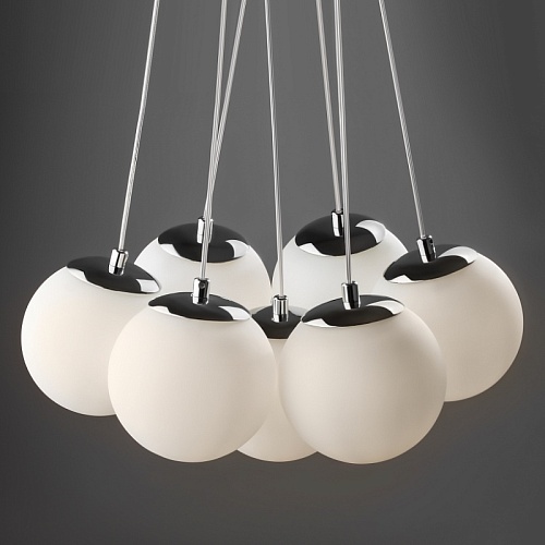 Арматура - металл, оттенки - хром и латунь. Плафоны-сферы из белого матового стекла. Подвесы двух видов: с регулируемой высотой на 7, 13, 19 ламп с цоколем E27 - помещены внутри плафонов на прозрачных проводах, и с фиксированной высотой на 6 ламп с цоколем Е14 - незаметно расположены над декоративным "облаком" плафонов.