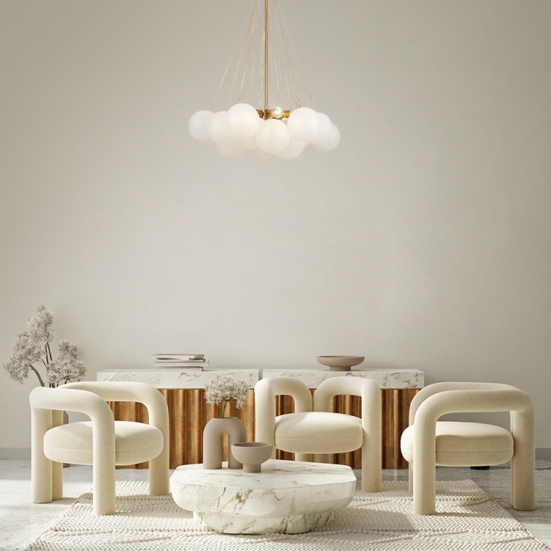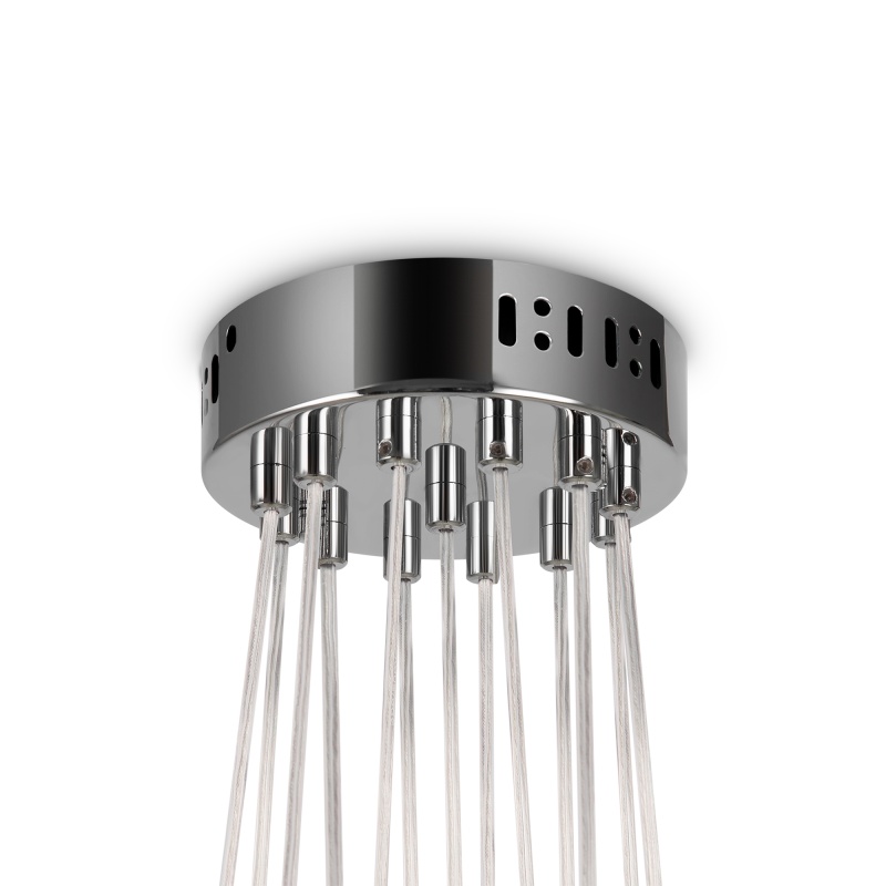 Арматура - металл, оттенки - хром и латунь. Плафоны-сферы из белого матового стекла. Подвесы двух видов: с регулируемой высотой на 7, 13, 19 ламп с цоколем E27 - помещены внутри плафонов на прозрачных проводах, и с фиксированной высотой на 6 ламп с цоколем Е14 - незаметно расположены над декоративным "облаком" плафонов.
