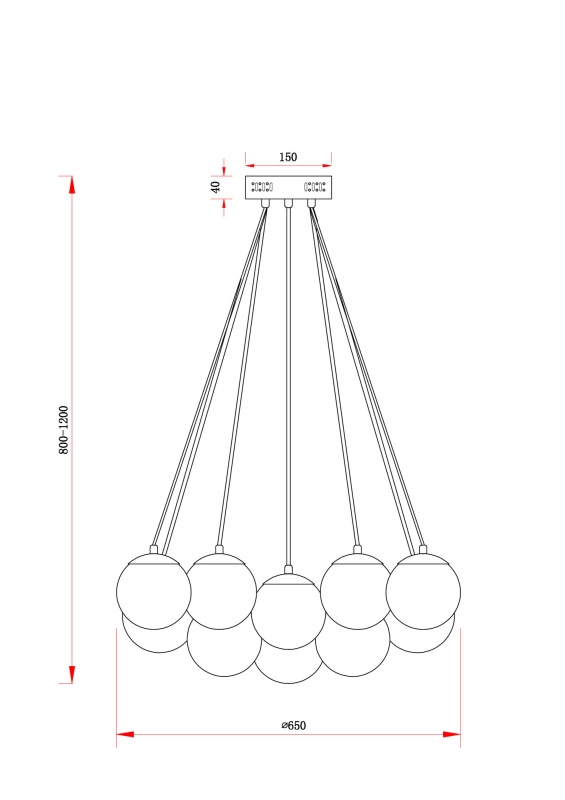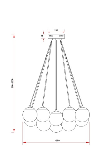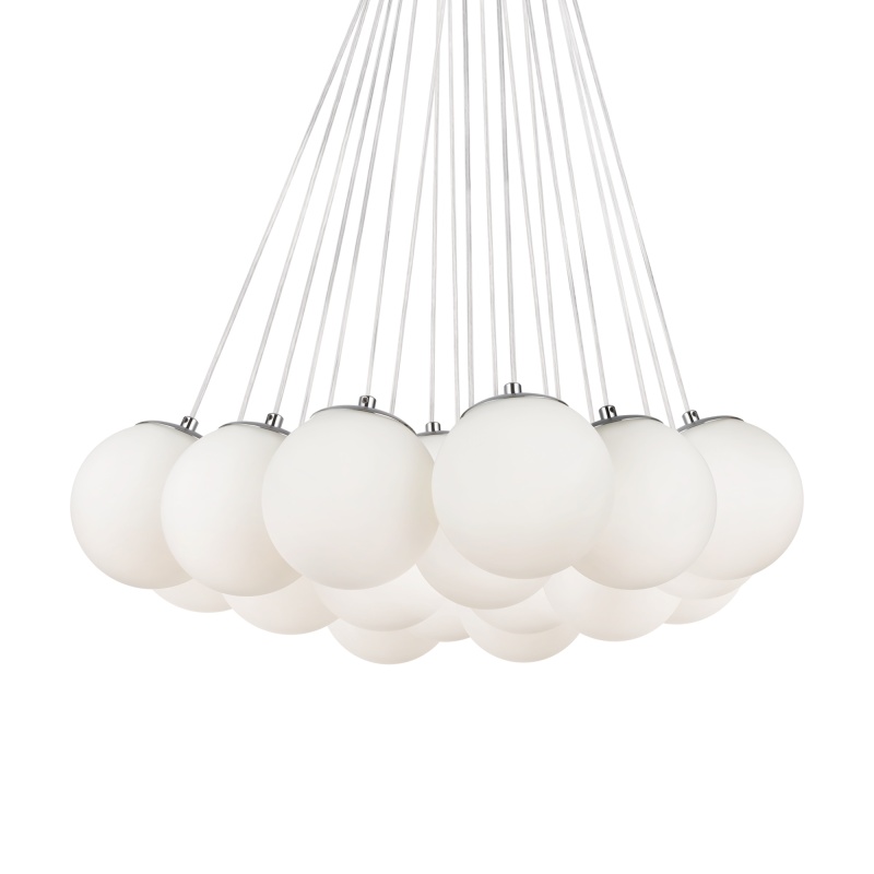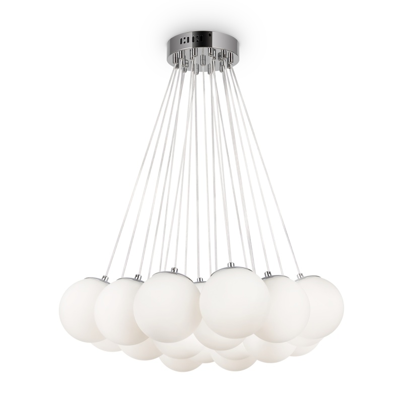 Арматура - металл, оттенки - хром и латунь. Плафоны-сферы из белого матового стекла. Подвесы двух видов: с регулируемой высотой на 7, 13, 19 ламп с цоколем E27 - помещены внутри плафонов на прозрачных проводах, и с фиксированной высотой на 6 ламп с цоколем Е14 - незаметно расположены над декоративным "облаком" плафонов.