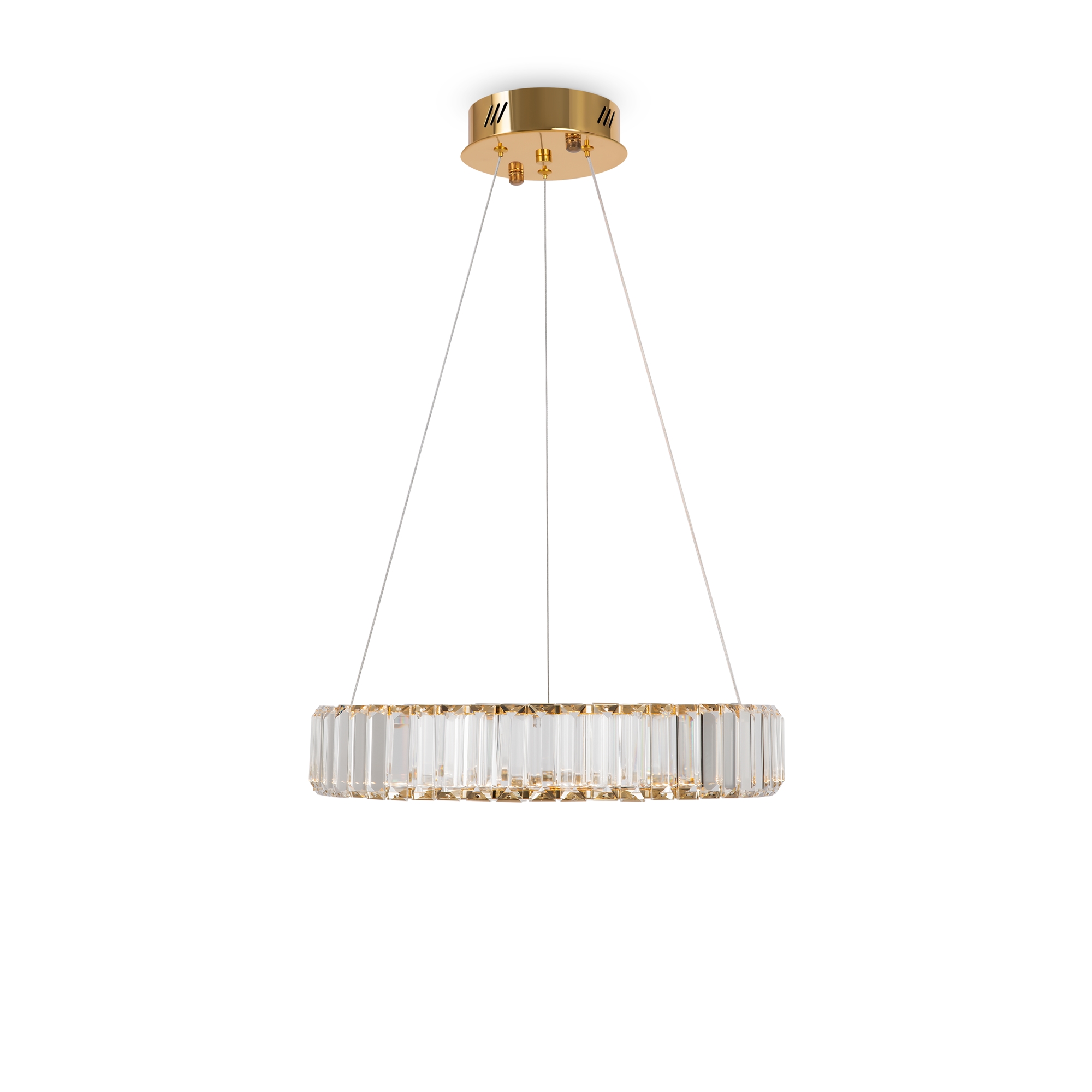 Металлическая арматура в цвете латунь и хром. Хрустальные декоративные кольца с геометричными гранями. LED-источник света. Регулировка цветовой температуры (3000-4000-5000K) и яркости 4G-dimming при помощи пульта (в комплекте).