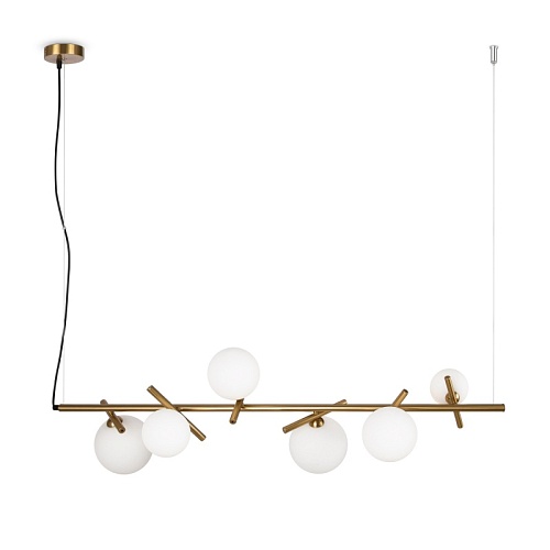 Материал арматуры — рифленый металл, цвет — латунь. Плафоны-сферы из белого матового стекла для мягкого заливающего света. Воздушный образ плафонов, строгие тонкие линии арматуры придадут интерьеру изящество и легкость. Высота подвесов регулируется. Источник света — лампы с цоколем G9.