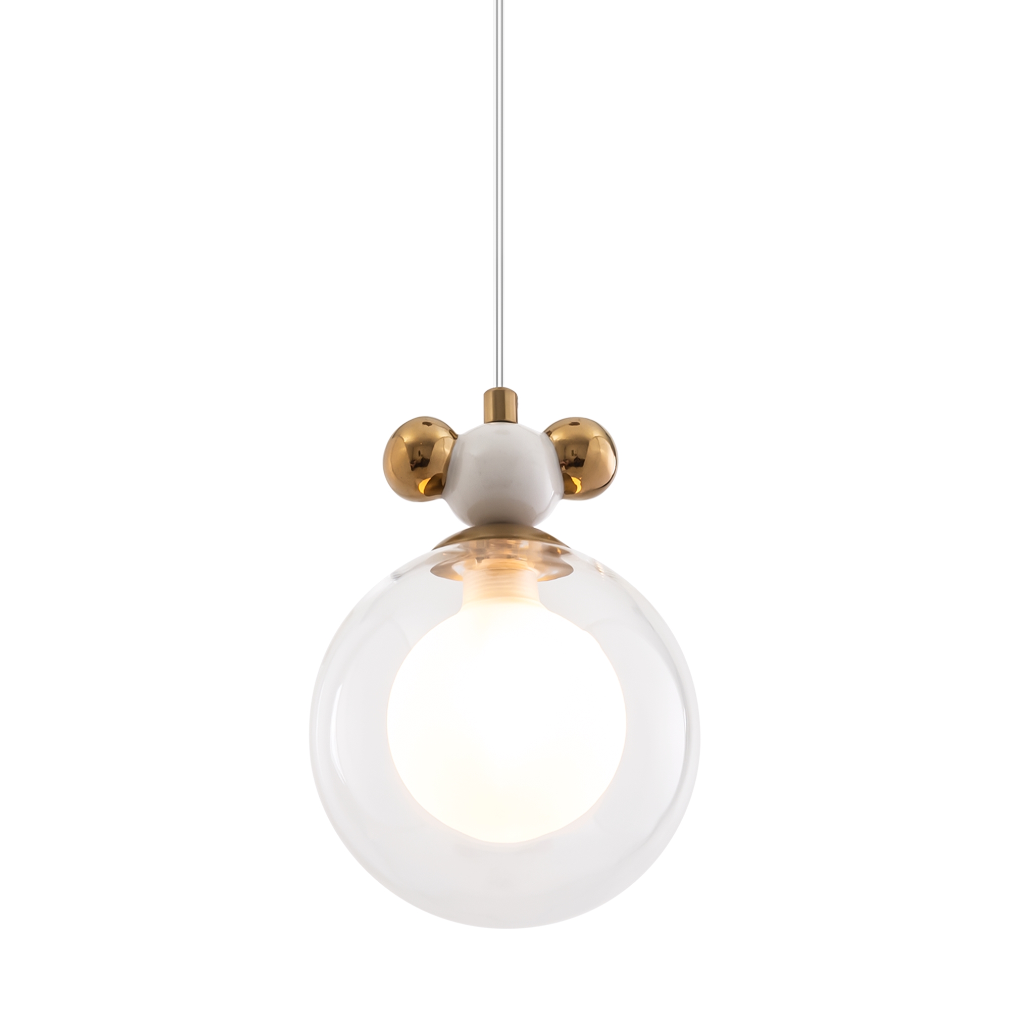 Металлическая арматура, два цвета — латунь и хром. Разные по форме плафоны — цилиндрические или овальные, украшены металлическими шариками. Стекло двойное, прозрачное или с легким матовым напылением. Конструкцию можно регулировать по высоте. Источником света служит лампа с цоколем G9 или Е14.
