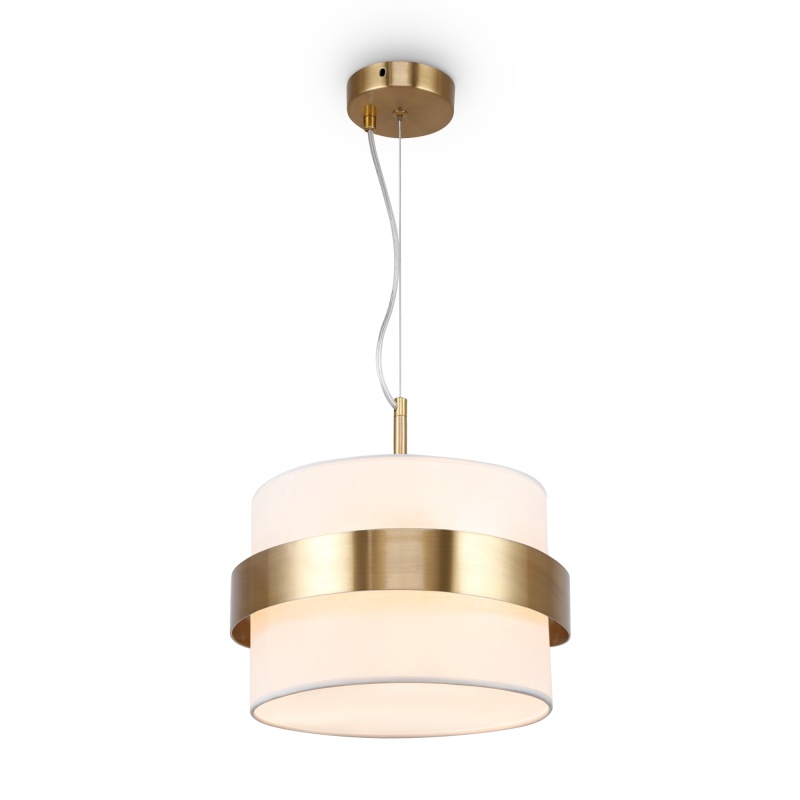 Цилиндрической формы абажур из ткани белого цвета. Декоративная парящая окантовка из металла в цвет арматуры. Регулируется по длине. Компактные размеры подходят для низких потолков и небольших интерьеров. Металлическая арматура, цвет - латунь и никель. Источник света — лампа с цоколем Е14, E27 и для настенного бра дополнительный LED с температурой свечения 3000 K.