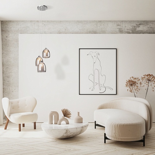 Арматура из металла в цвете хром. Двойные стеклянные плафоны в 3-х оттенках: дымчатый, коньячный, прозрачный. Компактные светильники-каскады в 2-х комбинациях — с одним плафоном и тремя. Высота тросов регулируется. Источник света — лампа с цоколем Е27