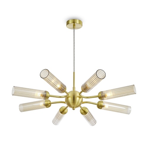 Арматура из металла, цвет — золото. Рельефные плафоны в тренде ZIGZAG. Материал — стекло, цвет — янтарный. Высота подвесных светильников регулируется. Плафоны закреплены на металлическую сферу. Источник света — лампа с цоколем G9.