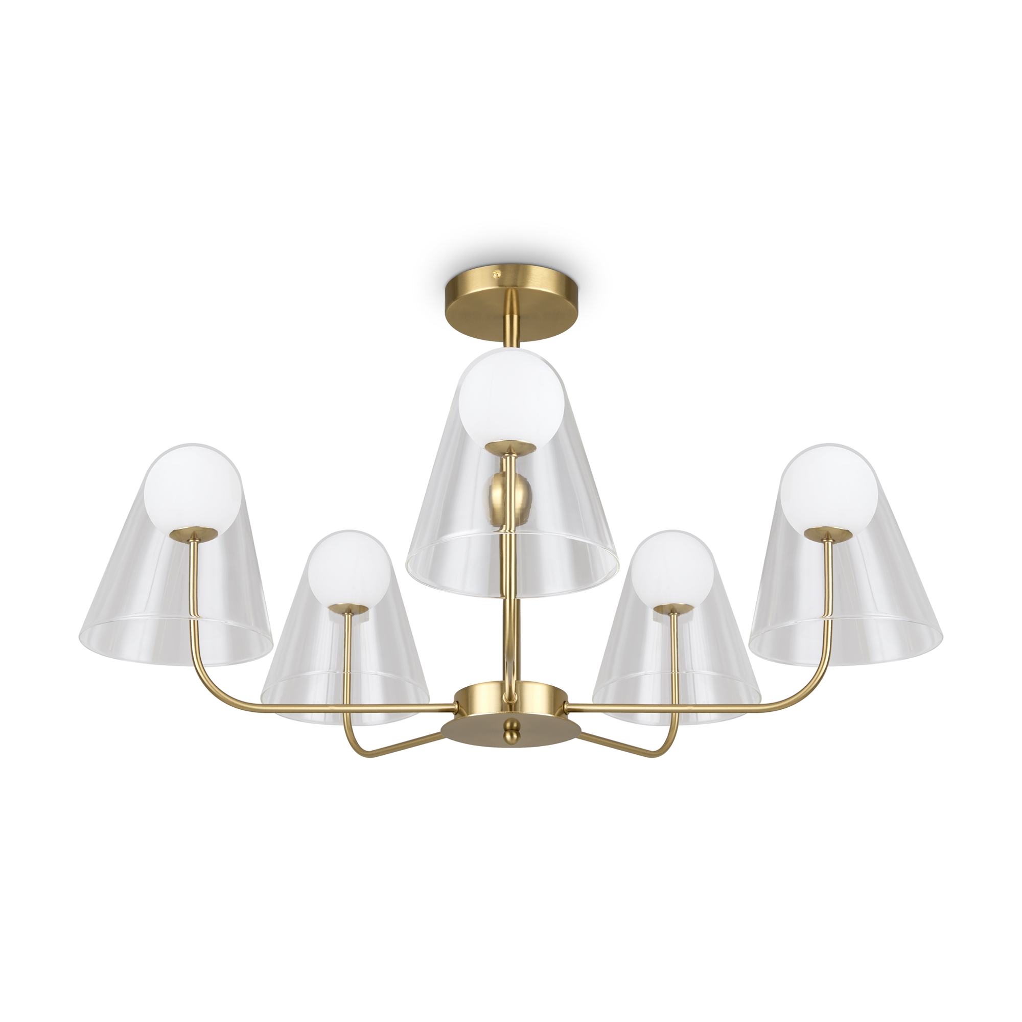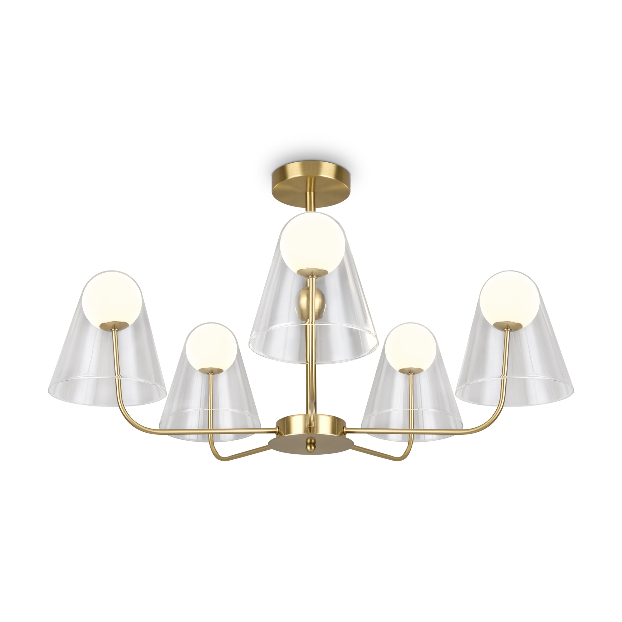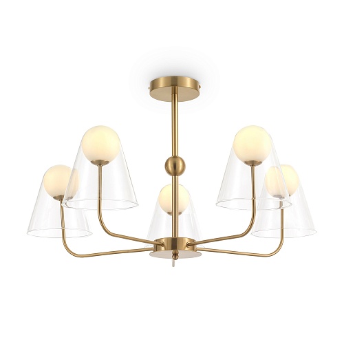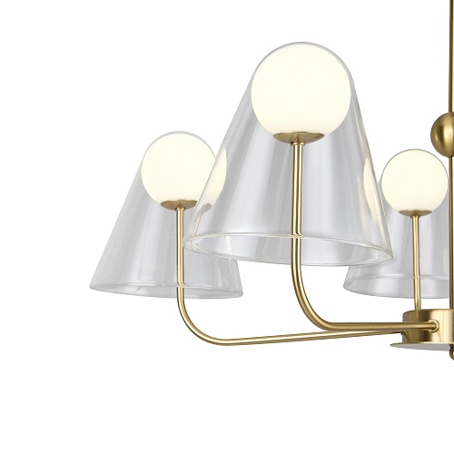 Арматура — металл, цвет — латунь. Двойные плафоны из стекла. Внешний — прозрачный в форме конуса плавно обрамляет контуры внутреннего матового сферического плафона. Свежий взгляд в дизайне на комбинацию форм и фактур. Источником света служит лампа с цоколем G9.