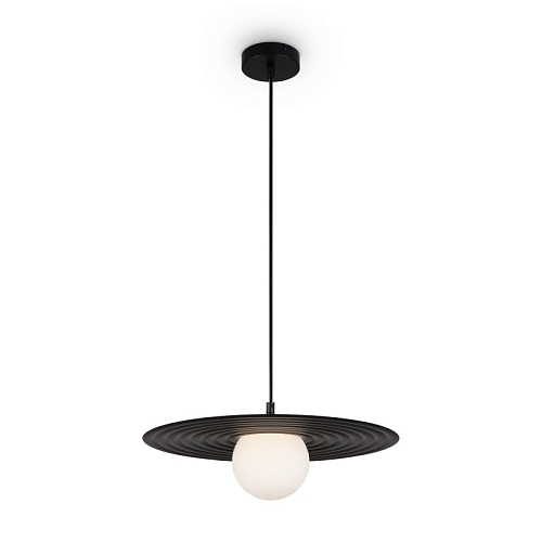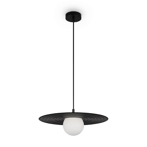 Арматура — металл, цвета — чёрный и белый. Матовый белый плафон с декоративным элементом — металлической тарелкой. Можно регулировать минимальную и максимальную высоту. Лампа с цоколем G9 служит источником света.