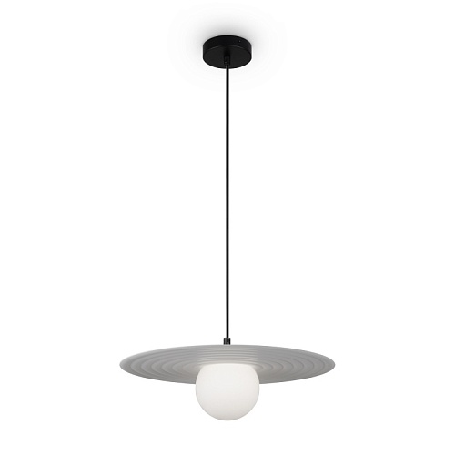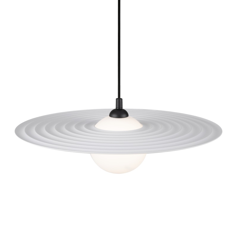 Арматура — металл, цвета — чёрный и белый. Матовый белый плафон с декоративным элементом — металлической тарелкой. Можно регулировать минимальную и максимальную высоту. Лампа с цоколем G9 служит источником света.