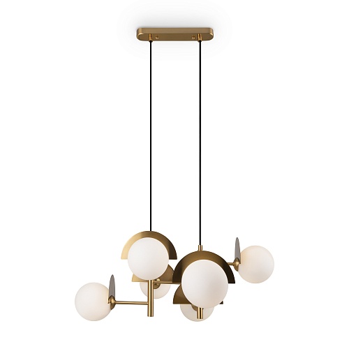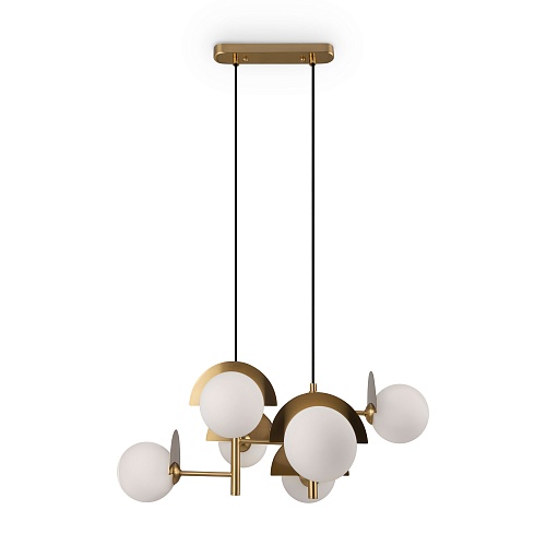 Арматура — металл, цвет — разноцветный или латунь. Белые матовые плафоны из стекла украшены металлическими золотыми или цветными лепестками. Динамичный дизайн для интерьеров в стиле Мемфис. Разнообразие форм в одной конструкции позволяет создать яркое освещение в больших комнатах. Высота регулируется. Источником света служит лампа с цоколем G9.