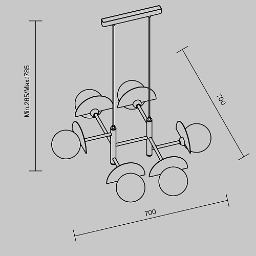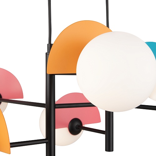 Арматура — металл, цвет — разноцветный или латунь. Белые матовые плафоны из стекла украшены металлическими золотыми или цветными лепестками. Динамичный дизайн для интерьеров в стиле Мемфис. Разнообразие форм в одной конструкции позволяет создать яркое освещение в больших комнатах. Высота регулируется. Источником света служит лампа с цоколем G9.