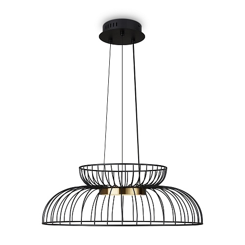 Металлическая арматура чёрного цвета. LED-источник света обрамлен декоративным металлическим кольцом цвета латунь. Минималистичный дизайн - хорошо сочетается с другими осветительными приборами. Высота подвеса регулируется. Цветовая температура - 3000К.