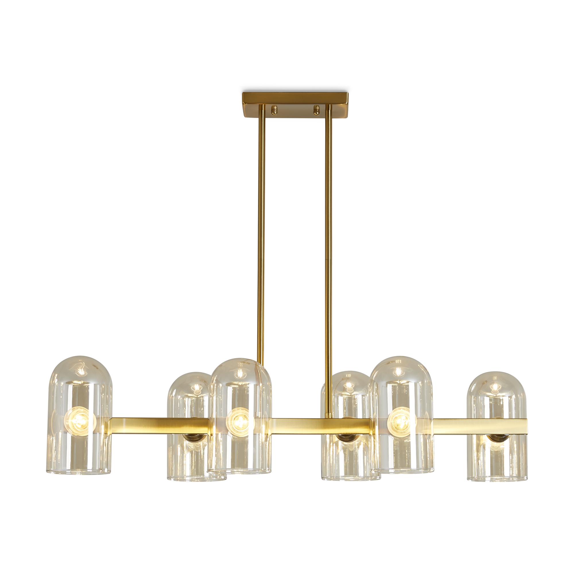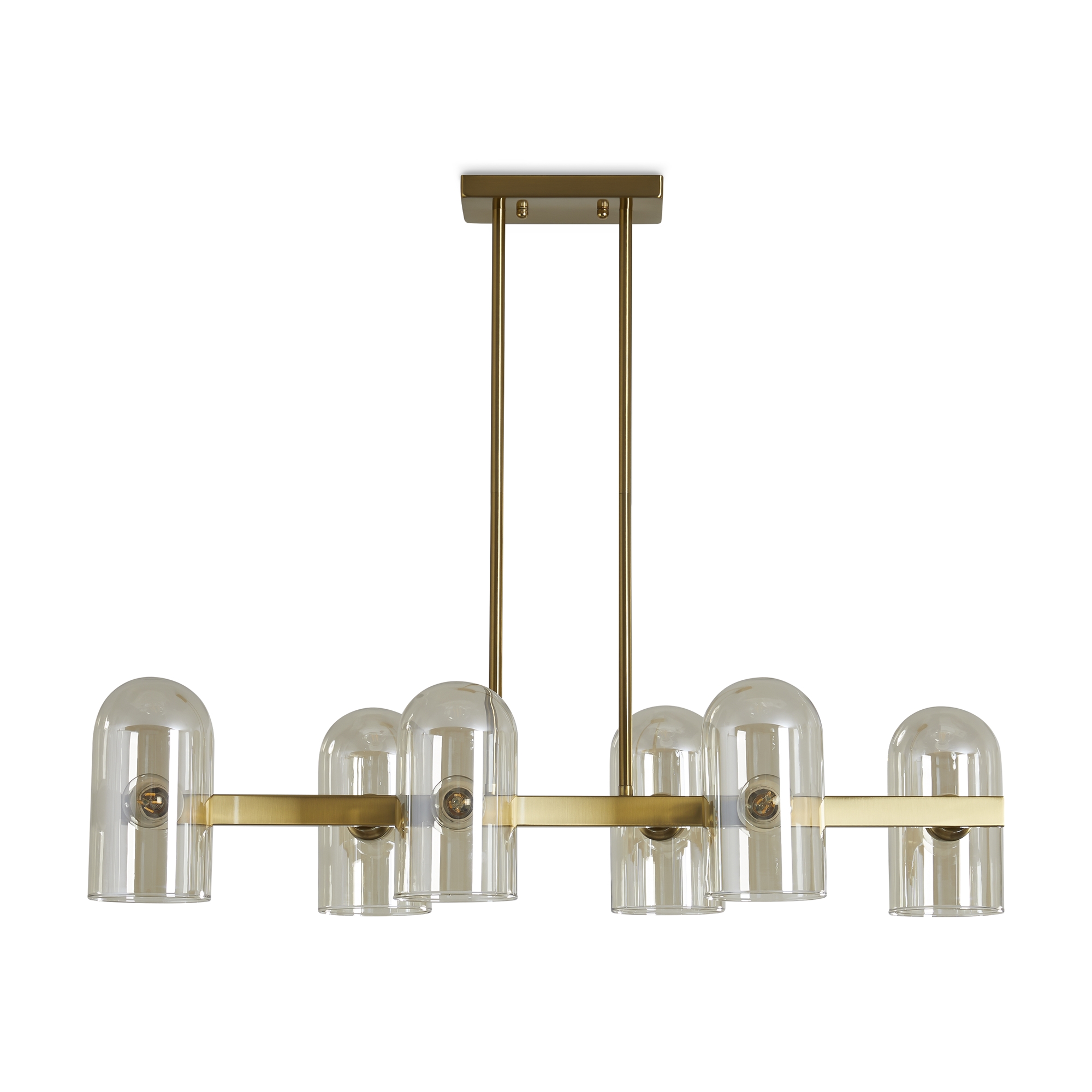 Арматура — металл. Цвет — латунь. Горизонтальные подвесы на твердой ножке. Плафоны из коньячного стекла в форме конуса. Направление плафона у настенного светильника можно регулировать за металлическое основание. Источник света лампа. Цоколь E14.