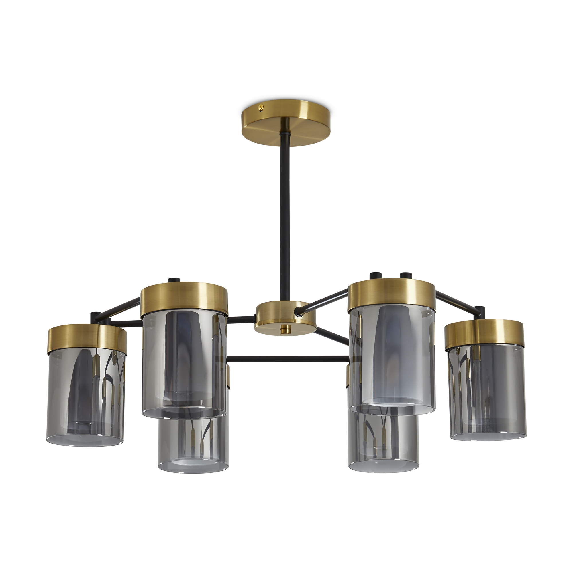 Арматура - металл в двух востребованных оттенках латунь и черный. Плафоны из двойного стекла дымчатого оттенка, внутри белый матовый. Трендовая форма плафонов в виде цилиндра. Потолочные светильники подойдут для помещений с низкими потолками. Источник света лампа. Цоколь E14