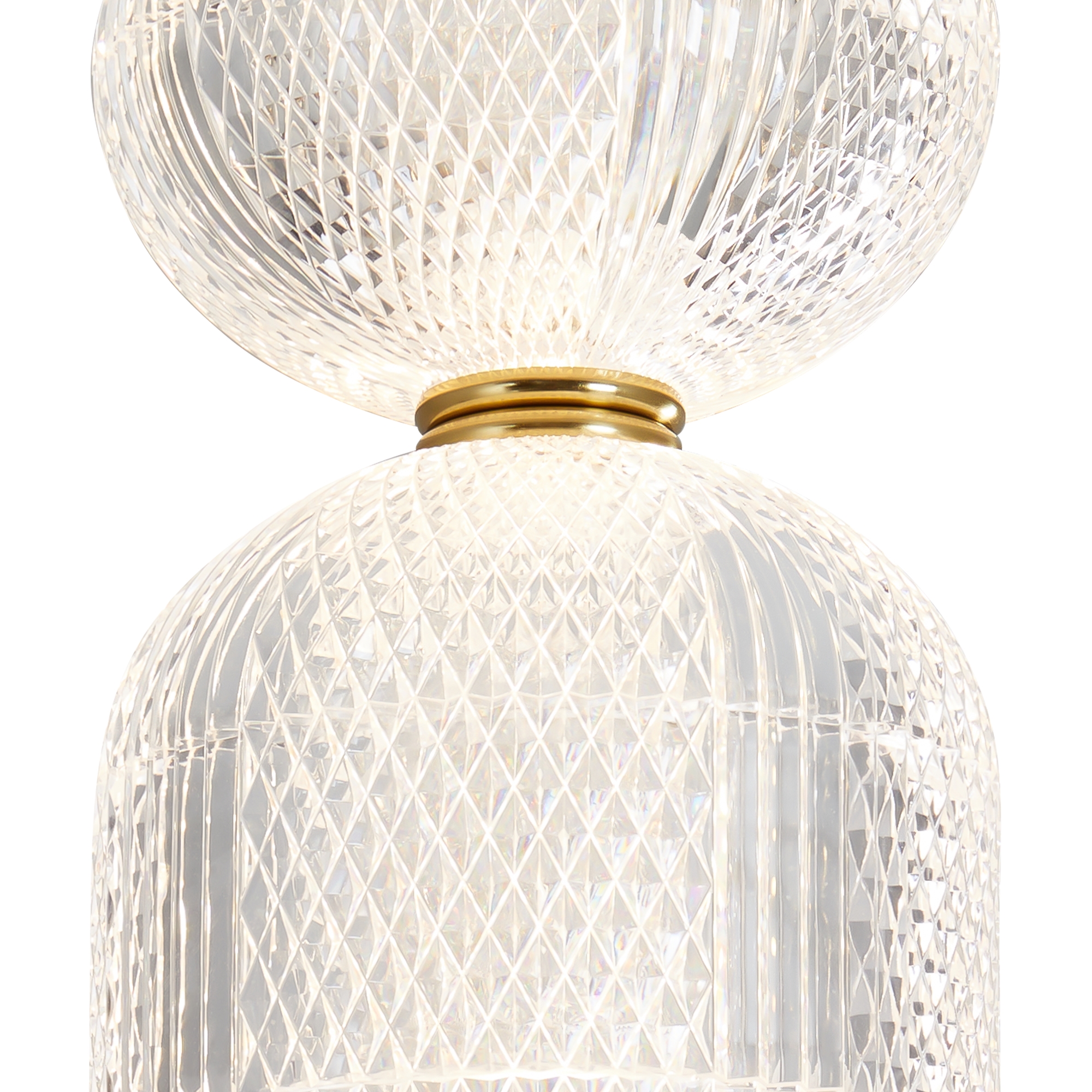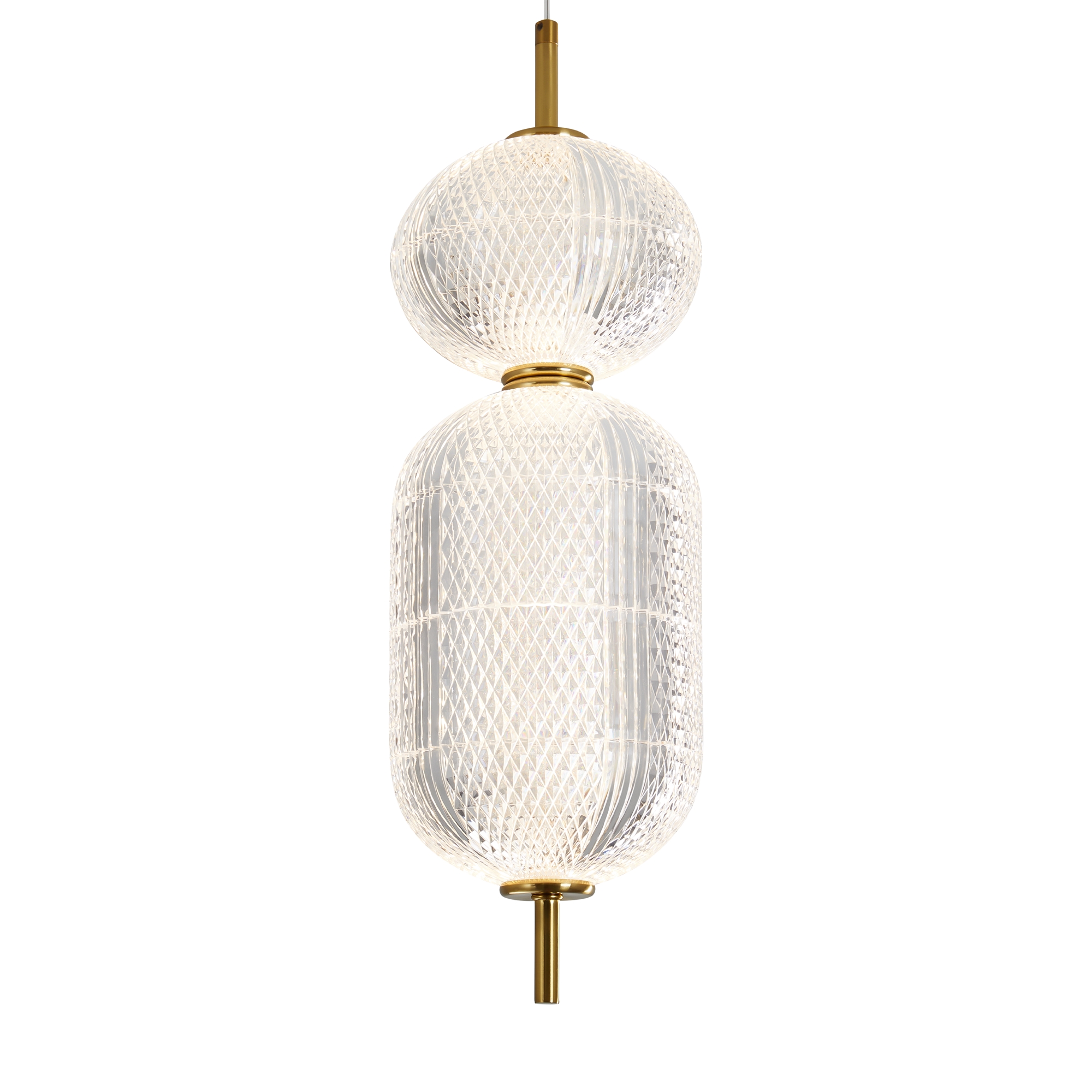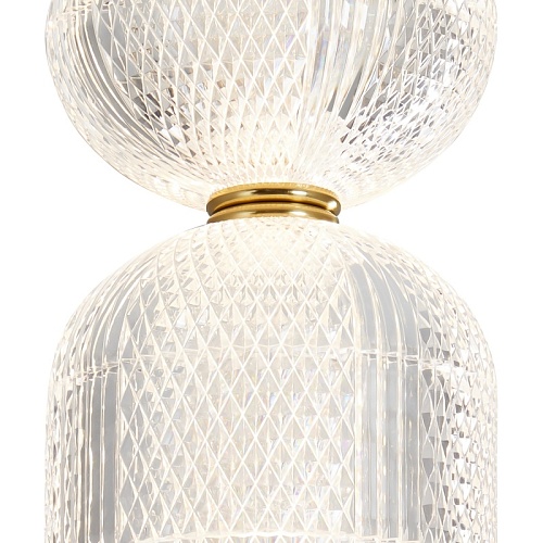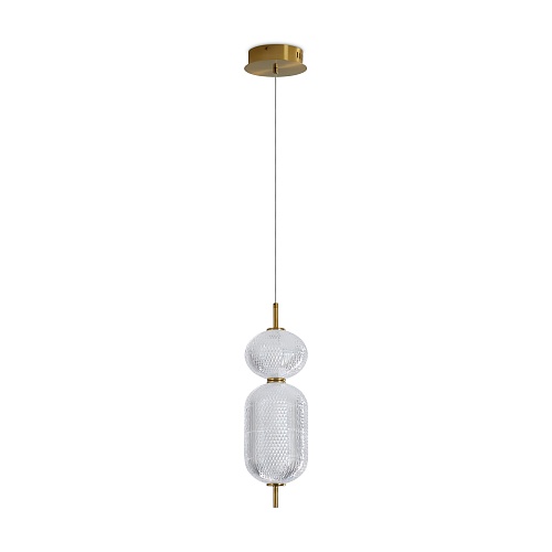 Арматура выполнена из металла в цвете латунь. Прозрачные плафоны. Вертикальные и горизонтальные подвесные светильники разных размеров. LED источник света. Цветовая температура 3000К.