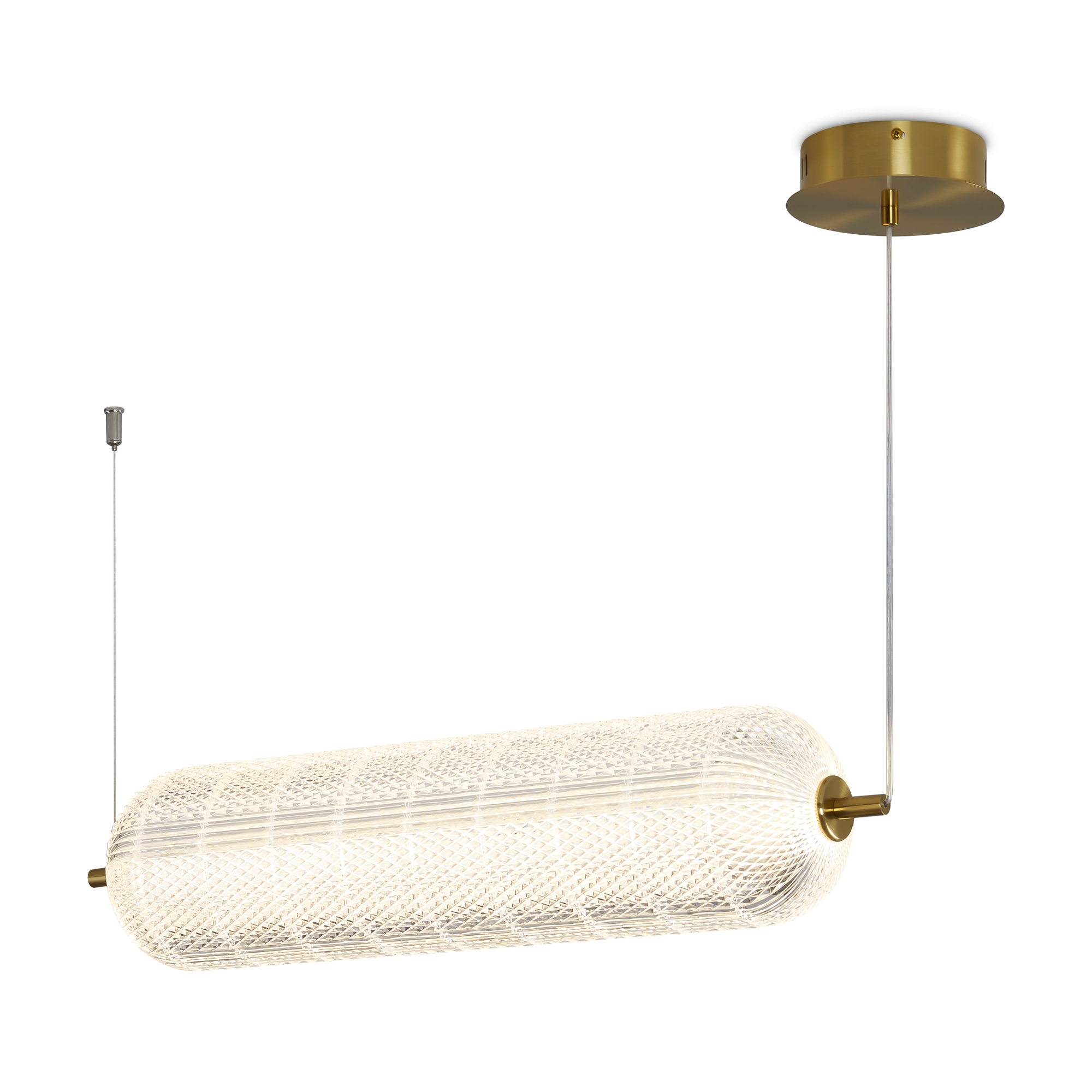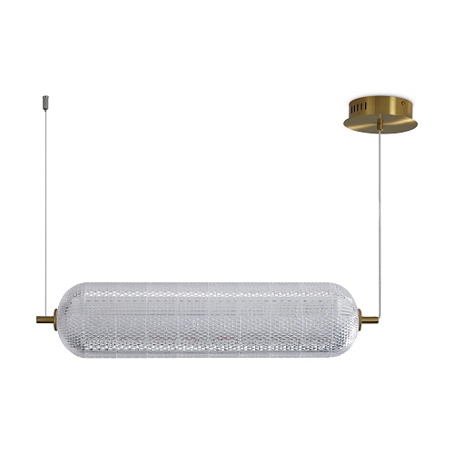 Арматура выполнена из металла в цвете латунь. Прозрачные плафоны. Вертикальные и горизонтальные подвесные светильники разных размеров. LED источник света. Цветовая температура 3000К.