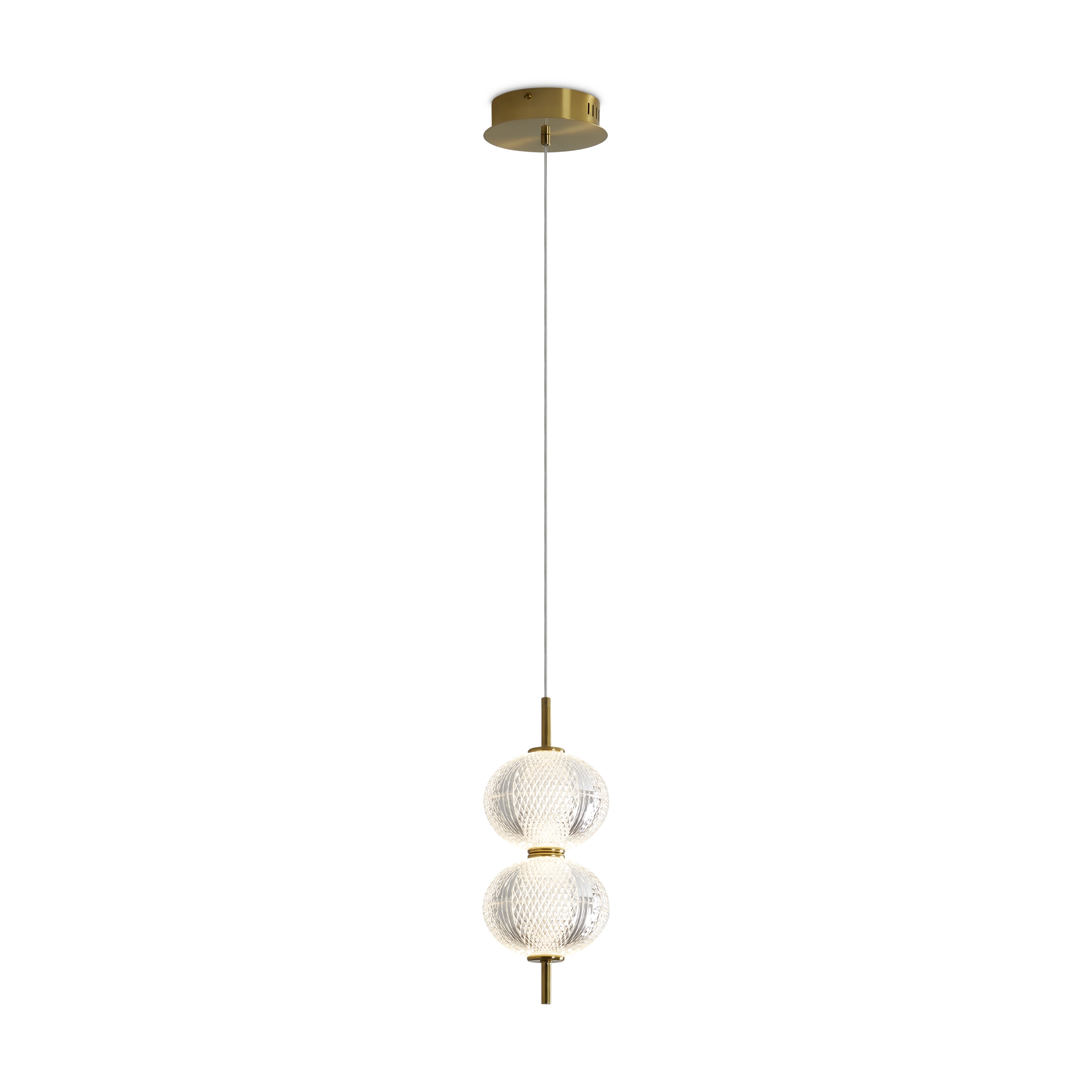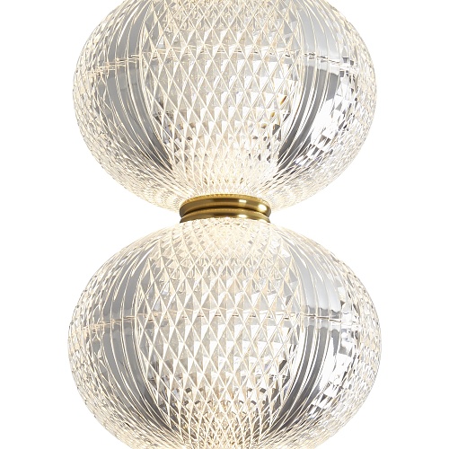 Арматура выполнена из металла в цвете латунь. Прозрачные плафоны. Вертикальные и горизонтальные подвесные светильники разных размеров. LED источник света. Цветовая температура 3000К.
