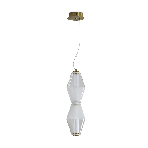 Арматура из металла. Цвет латунь. Плафон из матового, кристально прозрачного и дымчатого стекла. Горизонтальные и вертикальные подвесы. LED источник света. Цветовая температура 3000К.