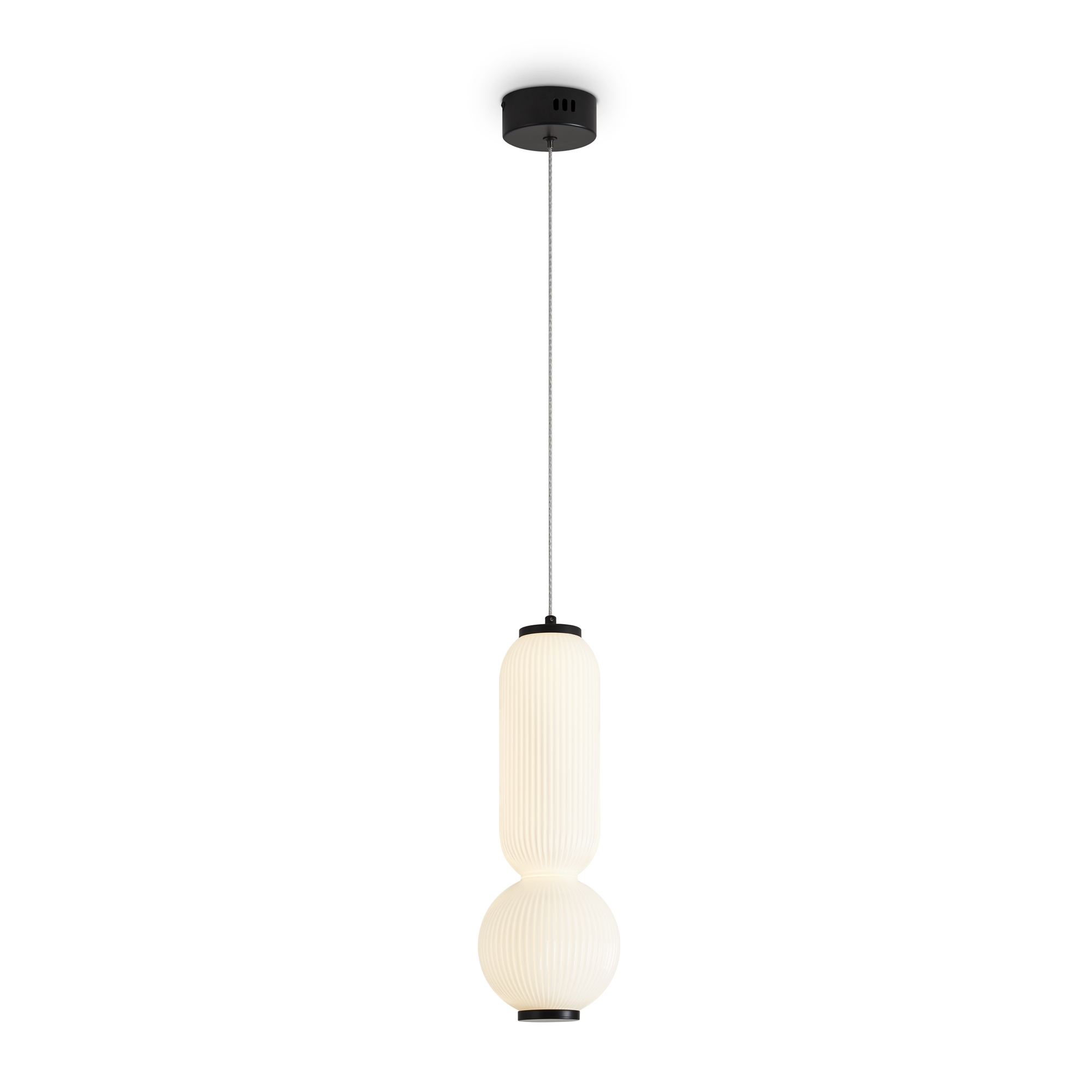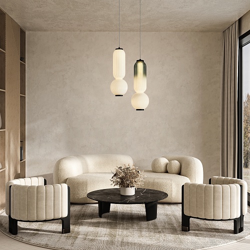 Арматура металл. Цвет черный. Плафоны вытянутой формы из подкрашенного стекла. Цвет матовый белый и зелено-белый. Одинарные подвесы. LED источник света. Цветовая температура 3000К.